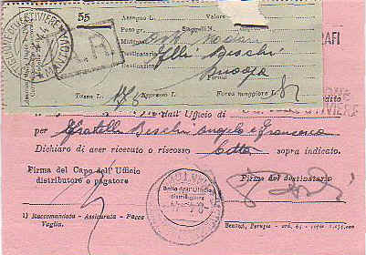 Ricevuta di ritorno spedita da Castiglione delle Stiviere( MN) il 6-4-1944, in periodo RSI, per città, affrancata con tre valori cent 5 Imperiale + cent 10 imperiale, per un totale di cent 25: in questo periodo era in vigore il tariffario Regno 1-7-40, che prevedeva, per la ricevuta di ritorno, la tariffa di 50 cent. In questo caso si è voluta applicare la tariffa ridotta per distretto. Infatti il costo della ricevuta di ritorno, pur avendo una tariffa sua propria, è stato molto spesso uguale a quello della lettera semplice, e come per la lettera semplice ed altri oggetti e servizi, dal 1 gennaio 1891 fu soggetta ad una tassa ridotta quando circolava nell'ambito del distretto d'impostazione. Questa agevolazione scomparve dopo più di vent'anni, in concomitanza con l'aumento tariffario del 1 aprile 1920. Bisogna attendere l'entrata in vigore del tariffario del 1 agosto 1947 che aboliva le tariffe del distretto, perché "l'errore" terminasse.