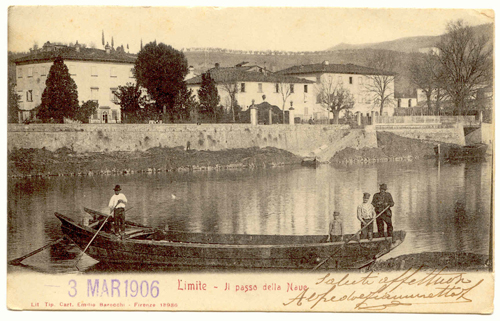 “Il passo della nave”, così era definito in modo un po’ pretenzioso il punto di attraversamento dell’Arno, con il barcone spinto dalle pertiche sul letto del fiume. L’immagine raffigura la barca sulla sponda della Tinaia, con Limite al di là del fiume. Quel singolare percorso era praticato anche per la corrispondenza in partenza da quel borgo, come conferma il bollo di partenza di Limite sul retro della cartolina raffigurante la piccola località, spedita nel 1901, nove anni prima dell’espresso in questione. E’ tuttavia probabile che il mittente, essendo la località priva di cassetta per le lettere, abbia ritenuto più comodo prendere il traghetto ed imbucare a Limite piuttosto che recarsi ad Empoli; come pure é probabile che le cartoline raffiguranti Tinaia fossero in vendita proprio a Limite. In questi casi quindi l’attraversamento sarebbe stato percorso privatamente e non dal servizio postale.