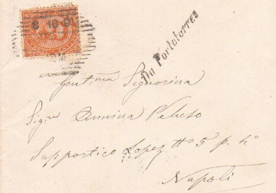 Lettera in partenza da Genova impostata al battello, in transito da Livorno ove venne apposto il bollo “Da Genova”, il bollo “Livorno” ed il bollo “numerale a punti 14” annullatore del 20 c. “Bigola” dell’ufficio di città in data 6.11.1872, per poi giungere a Napoli in data 9.11.1872.