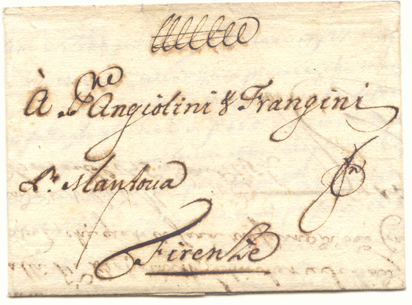 Vienna 27. 4. 1729. Lettera per Firenze spedita con la posta integrata austriaca dei Von Paar e dei Della Torre e Tasso f.co Mantoua, franca fino a Mantova. Qui il Mastro della Famiglia provvide all’instradamento per la prosecuzione del trasporto fino a destinazione.