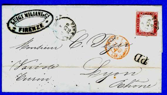 Segnalazione di strani annulli: tra le cose strane che si possono trovare in Toscana questa è una delle tante non segnalate dal Bargagli: annullo ad un cerchio con ornato a fiocco di Firenze (28/01/1863). Ho avuto modo di vedere questo bollo con l’indicazione del mese con la lettera finale errata infatti reca la lettera “M” al posto della lettera “N”. La lettera è impreziosita dalla presenza di un esemplare di un esemplare di Sardegna da cent. 40 recante l’effigie con la grande incrinatura trasversale dall’alto al basso (tariffa di posta ordinaria 1° porto per la Francia).
