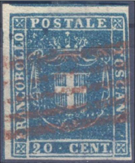 Si tratta di un bellissimo esemplare del 5c. del Governo Provvisorio di Toscana con un leggero annullo che non deturpa la bellezza del francobollo.