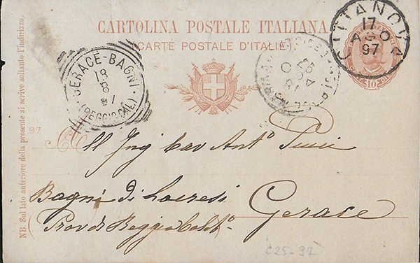 Ma ecco il problema; negli elenchi successivi a quello del 1903/04 l’ufficio non compare più e, salvo sviste, nessun B.U. ne ha comunicato la soppressione. Per avere qualche lume non restava che controllare se c’era qualche frazionario attualmente libero, da potersi presumere assegnato a Gerace Bagni, dato che, promosso a ufficio, svolgeva anche servizi a danaro. Sia considerando l’anno 1896 di istituzione o la successiva trasformazione in ufficio, l’ipotetico frazionario di Gerace Bagni doveva essere compreso nell’elenco iniziale in ordine alfabetico, comprendente, come abbiamo più volte ricordato, gli stabilimenti postale esistenti al 31.12.1905. Ma ecco la sequenza: 53/43 GALLINA, 53/44 GERACE MARINA, 53/45 GERACE SUPERIORE, 53/46 GIFFONE, ovvero nessuna traccia di Gerace Bagni. A questo punto è venuto il dubbio che essendo un ufficio temporaneo fosse inserito in coda all’elenco, ma l’ultimo ufficio della sequenza alfabetica, VITO ha il 53/124 e il successivo 53/125 fu assegnato a PIETRAPENNATA. Istituito il 1° aprile 1906 e primo ufficio della sequenza cronologica. Da tutto ciò se ne deduce che GERACE BAGNI fu soppresso alla fine della stagione termale 1905, perché appunto non compare nell’elenco dei frazionari. D’altra parte, se consideriamo le condizioni socio-economiche della costa ionica in quell’epoca, le terme dovevano avere una frequentazione prettamente locale e quindi le necessità di dover ricorrere al servizio postale assai limitate, con conseguente scarsissimo utilizzo dell’ufficio, tale da giustificarne la chiusura e i soli dieci anni di funzionamento, solo stagionale, ci fanno capire perché il timbro era tuttora inedito.