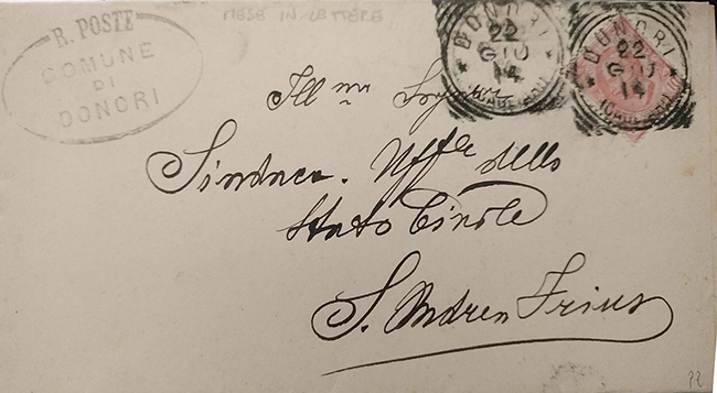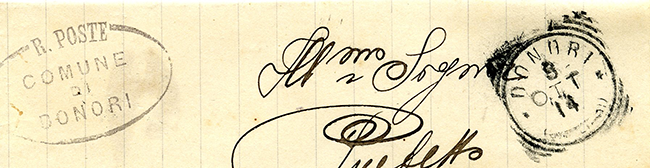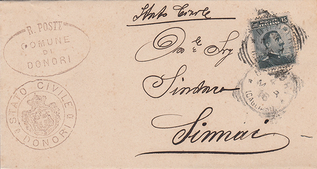Donori è un comune italiano di 1.896 abitanti della città metropolitana di Cagliari dalla quale dista circa 30 chilometri. Nel censimento del 1911 contava 918 abitanti. In zona collinosa è stata un'importante zona mineraria, anche ricca di antichi vigneti dove vengono coltivati vitigni autoctoni come il Cannonau ed il Bovale sardo. La zona è nota anche per la produzione casearia. A Donori è presente anche una sviluppata zona industriale attiva dalla fine degli anni novanta. Già nel 1888 disponeva di un servizio postale istituto come Collettoria. Nel Nuovo Gaggero si conosce il tondo-riquadrato di Donori con mese in numeri, conosciuto dal 1902 al 1911. Nell'arco di pochi giorni, nel mese di giugno di quest'anno, mi è stato segnalato il ritrovamento di DONORI mese in lettere da Marco Cannas, Fabio Petrini, Paolo Pitzalis e Maurilio Bacchi. Le segnalazioni vanno dal 9-12-1913 al 4-3-1916, probabilmente questo timbro ha sostituito il precedente con mese in numero che ad oggi è conosciuto fino al 1911. Il Catalogo potrà essere aggiornato: 68044 - CA - Donori - tipo G - 1902-1911, mese lettere 1913-1916 24-09-2025