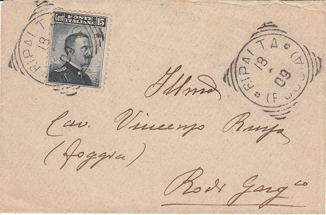 Fra i tanti pezzi di nuovo ritrovamento spicca Ripalta (FG) piccola frazione alle dipendenze di Poggio Imperiale di cui Luigi Teti mi ha mandato un annullo dell'11.4.1902 e di cui posseggo un annullo del 18.6.1909 (il mese si rileva dall'annullo in arrivo di Rodi sul retro). La frazione fu dotata di servizio rurale nel 1^ trimestre del 1869 (1) alle dipendenze di Poggio Imperiale e non doveva avere piu' di 400 abitanti. Probabilmente il numero di abitanti continuo' a diminuire in quanto nel censimento del 1901 non viene neppure citata, ed oggi la frazione risulta disabitata ed appartenente al comune di Lesina. L'annullo di Luigi, per il momento, e' la prima data nota ed il mio l'ultima: e' interessante notare che i due annulli sono differenti, quindi nel periodo furono usati 2 tipi. FG Ripalta tipo G 1902-1909, 2 tipi 09-07-2018