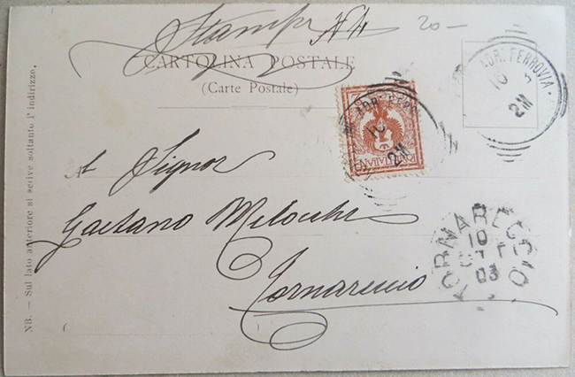 Nuovo ritrovamento di un annullo che avevo tenuto da parte perche' illeggibile (inviato da Luigi Teti) ma con questa immagine di Mirko Albertazzi e nella speranza di trovarne altri migliori si inserisce una nuova riga nei ritrovamenti: Castellam. Adr. Ferrovia (Raccom.) (TE) che è uno dei tanti annulli del comune che poi nel 1927 si fuse con Pescara, comune confinante che al tempo era in provincia di Chieti. Nel censimento del 1901 Castellammare faceva parte del circondario di Penne in provincia di Teramo, aveva 8926 abitanti ed era sede della stazione ferroviaria dotata di un suo ufficio postale. La lunghezza del nome era un problema per gli incisori dei timbri per cui si conoscono diverse abbreviazioni come Castellam. Adr., Castellammare Adr. Ferr., Castellammare Adria. Ferr. ed altri, ma questo non era ancora noto e verra' inserito a catalogo come: