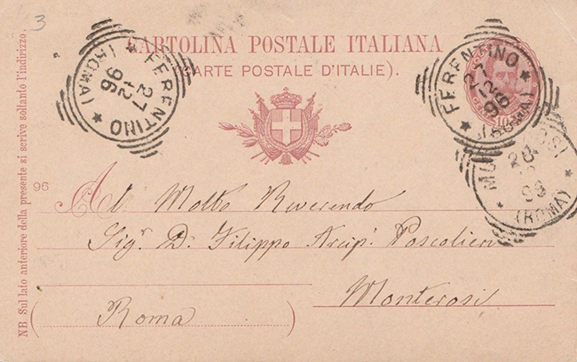 Monterosi (RM) del 28.12.1896 e' un primo ritrovamento di un annullo riportato dal Gaggero, ma non ancora visto. Luigi Teti, nell'inviare un aggiornamento di data non si era accorto che in arrivo e parzialmente incompleto vi era il comune di Monterosi che gia' nel 1901 era diventato comune autonomo con 788 abitanti. Passo' nel 1927 sotto la provincia di Viterbo ed oggi conta oltre 4500 abitanti, il forte sviluppo demografico avvenuto nell'ultimo decennio e' da attribuirsi sia per la vicinanza con il lago di Bracciano ed all'autodromo di Vallelunga, ma soprattutto alle iniziative del comune che ne hanno incentivato un forte sviluppo turistico.