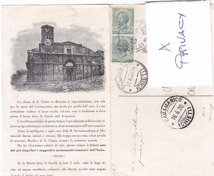 Il tondo-riquadrato di Bazzano (AQ) del 15.06.1920 e' un nuovo ritrovamento non riportato dal Gaggero.