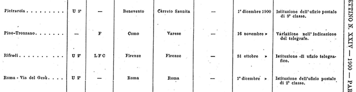 sembra che di fatto ci sia un cambio di denominazione e il passaggio dell'ufficio dalla 1ª alla 2ª Nell'elenco del 1900 (ricordiamo che i dati sono probabilmente quelli del 1899) tutto rimane uguale: