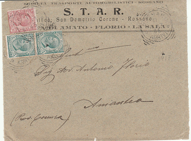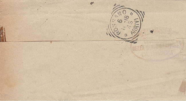 Sono noti diversi tondo riquadrati di Rossano: esistevano due uffici postali uno nel centro del paese e l'altro alla stazione ferroviaria e forse questo annullo era in funzione alla stazione in quanto la parola Arrivi lascia presupporre che venisse usato per la posta in arrivo, ipotesi immediatamente confutata dalla lettera di Mattia ove il timbro annulla una missiva in partenza.