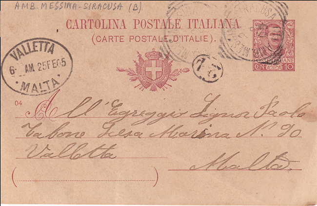La continua ed attenta ricerca di annulli mancanti nel Gaggero da parte di Luigi Teti ci porta a sbarcare in Sicilia; ecco che il Nostro ha scovato un AMB. MESSINA-SIRACUSA (B) in data 24.2.1905, primo bollo tondo riquadrato di un servizio ambulante insulare presentato in questa rubrica. La ferrovia Messina-Siracusa, o dorsale jonica, è una delle due linee ferroviarie principali della Sicilia. Già dal settembre 1860, con decreto del governo provvisorio di Garibaldi, la Società Adami e Lemmi di Livorno aveva ottenuto la concessione per la costruzione di varie ferrovie, incontrando poi l’opposizione del governo italiano e venne revocata. Si susseguirono altre società che per difficoltà finanziarie non riuscirono a concretizzare i lavori di costruzione. Finalmente nel 1866 la Società Vittorio Emanuele di Carlo Lafitte, costituita interamente con capitale francese, subentrò e riuscì a portare a termine la costruzione del tratto Messina - Giardini-Taormina il 12 dicembre 1866. Seguì, il 3 gennaio 1867, la Giardini-Taormina – Catania a cui seguirono il 1° luglio 1869 la Catania-Lentini ed il 19 gennaio 1871 la Lentini-Siracusa. Dopo che nel novembre 1899 iniziò il traghettamento di carri e carrozze tra Reggio Calabria e Messina venne istituito il 10 dicembre un servizio ambulate tra Reggio Calabria e Siracusa, § 524 del Bullettino N. XXIII del 1° dicembre 1899, primo collegamento senza soluzione di continuità con ambulanti della Sicilia con il resto della nazione. Con § 16 del Bullettino N. 2 del 14 gennaio 1905, si comunica che dal 1° gennaio l’ambulante fra Siracusa e Reggio Calabria è stato limitato a Messina. Questo servizio è poi attestato fino agli anni ’50 del secolo scorso. Potrà essere inserito a catalogo come: