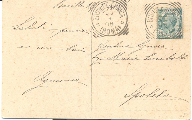Boville Ernica risulta un nuovo interessante ritrovamento del tondo riquadrato. Il comune e' un bellissimo antico borgo posto sulla cima di un colle nella Ciociaria e merita veramente di essere visitato. Il paese prima del 1907 si chiamava Bauco il cui tondo riquadrato mi e' noto dal 1895. Il "Gaggero-Mondolfo" riporta l'uso del lineare stampatello inclinato durante lo stato Pontificio e nel 1970 venne istituita una collettoria di seconda classe che l' 1-4-1881 divenne ufficio postale con il numero 3400. Nel 1907 il paese prese il nome di Boville Ernica ed anche l'ufficio postale cambio' i timbri. Ritengo che il tondo riquadrato sia stato usato per un breve periodo in quanto posseggo un circolare a lunette del 1915. Lo valuto 7 punti. Nel 1927 il paese entro' a far parte della nuova provincia di Frosinone. | ||||||||||||||||||||