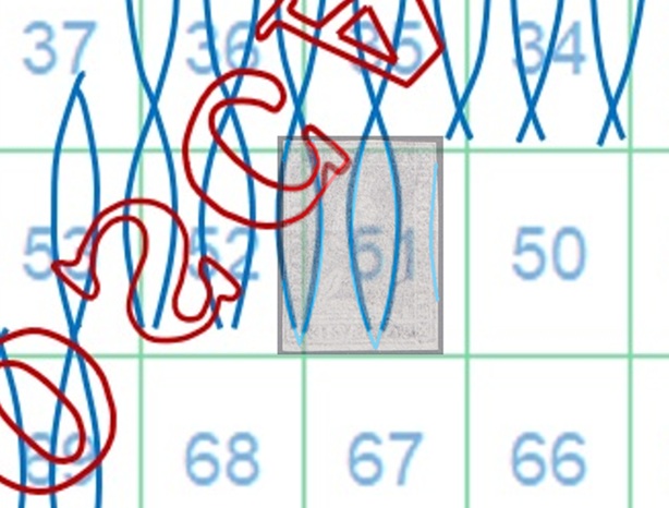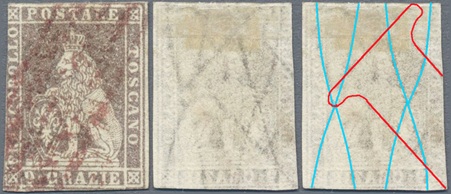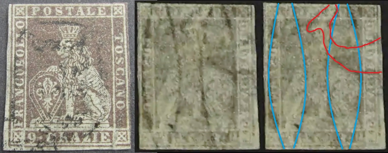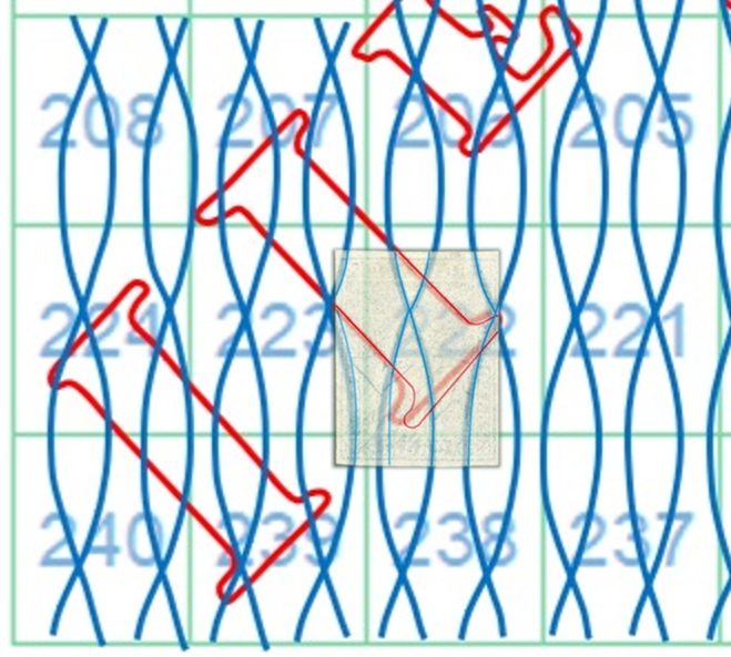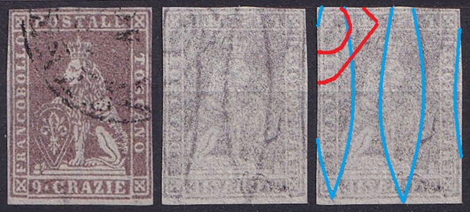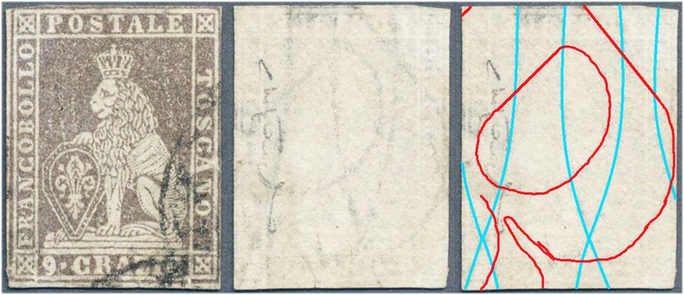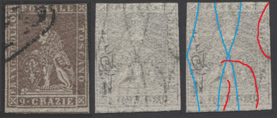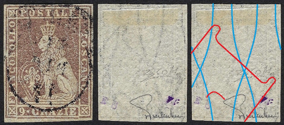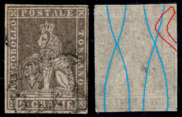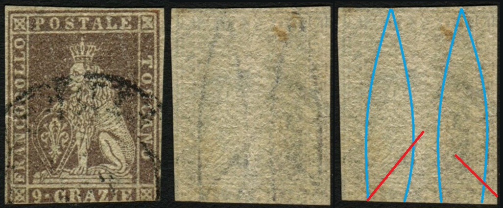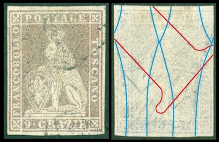 Dopo la pubblicazione della sezione relativa ai valori da 1 quattrino (1QII), da 1 soldo (1SII), da 1 crazia (1CrII), da 2 crazie (2CrII), da 4 crazie (4CrII) e da 6 crazie (6CrII), proseguiamo la presentazione dell'archivio dei Francobolli Granducali su Seconda Filigrana del tipo fil-let, riportando gli esemplari del valore da 9 crazie che siamo riusciti a reperire fino ad oggi. Per ogni francobollo riporteremo una parte descrittiva composta dal numero di archivio preceduto dal carattere #, seguito dalla sigla del francobollo, ovvero 1QII per il valore da 1 quattrino su Seconda Filigrana, 1SII per quello da 1 soldo su Seconda Filigrana, 1CrII per i valori da 1 crazia su Seconda Filigrana e analogamente per i valori da 2 crazie (2CrII), 4 crazie (4CrII), 6 crazie (6CrII) e 9 crazie (9CrII), seguito dalla configurazione della filigrana tra le quattro possibili (AS-BD, BD-AS, AD-BS e BS-AD), dalla posizione occupata dal francobollo nel quadro di stampa ed infine da un link che richiama una composizione grafica formata dalla sovrapposizione in trasparenza della filigrana del francobollo in esame e l'opportuna porzione della tavola di riferimento relativa alla configurazione della filigrana, come esemplificato nell'immagine che segue. Seguirà poi una parte grafica in cui mostriamo il francobollo affiancato dalla sua filigrana.