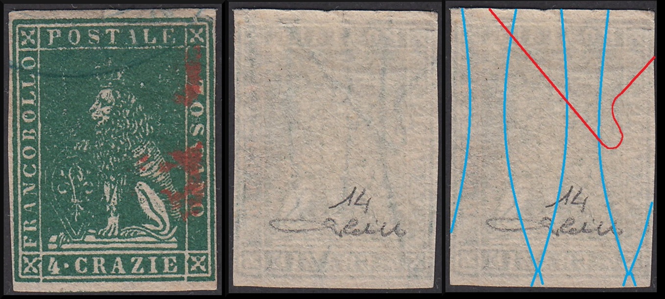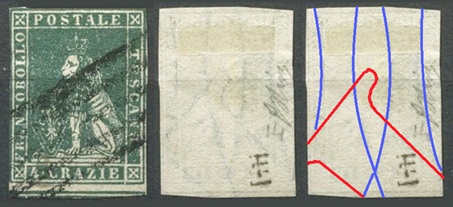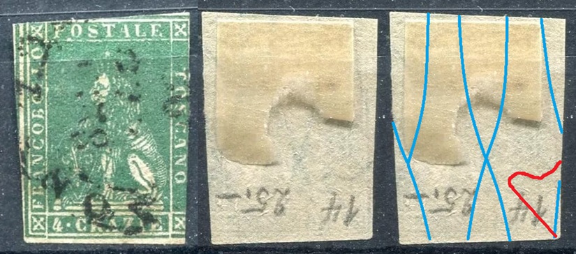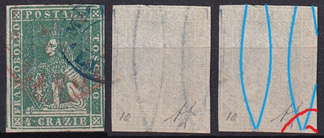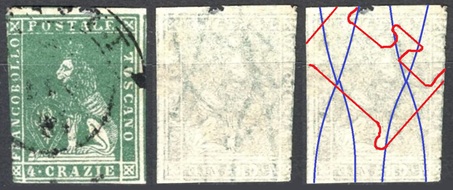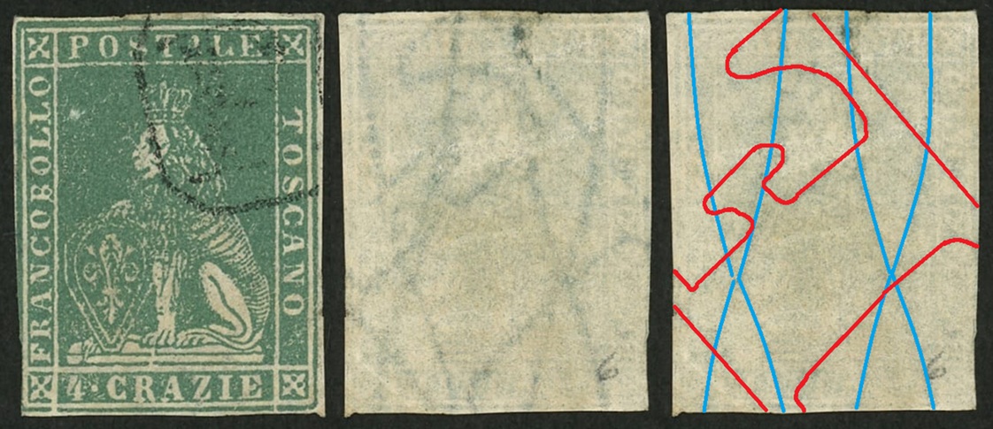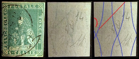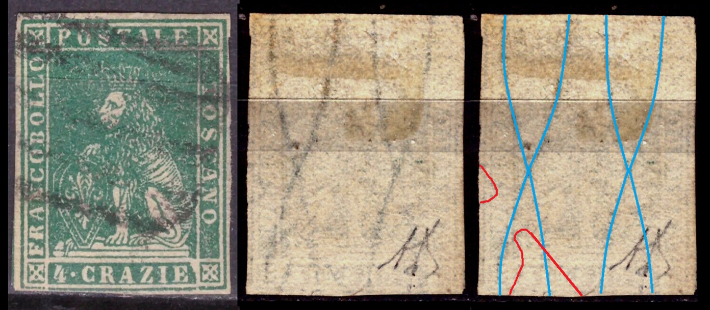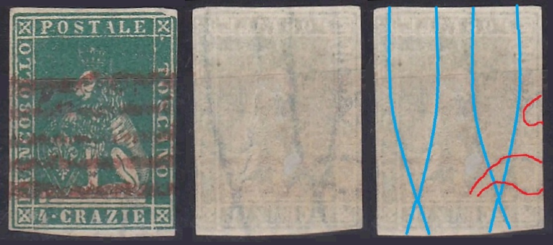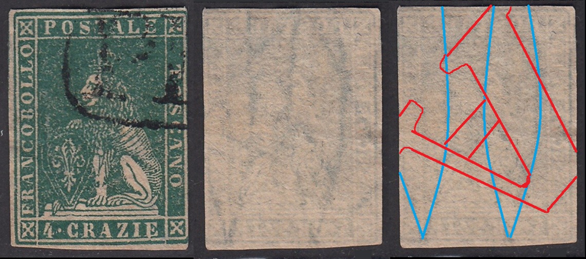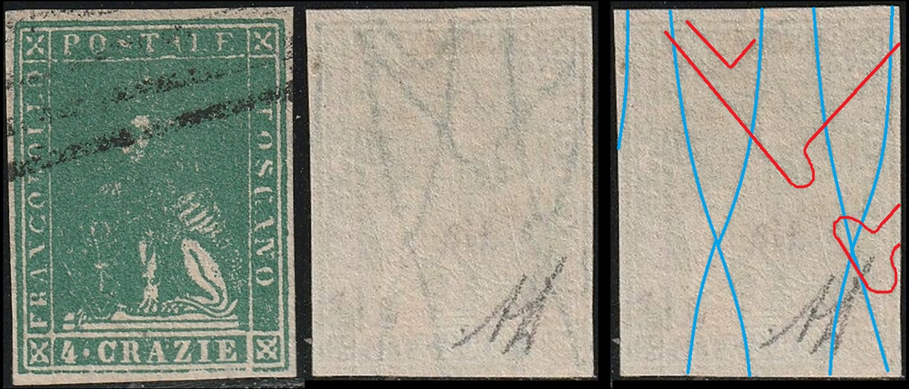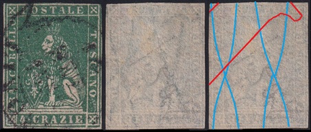 Dopo la pubblicazione della sezione relativa ai valori da 1 quattrino (1QII), da 1 soldo (1SII), da 1 crazia (1CrII) e da 2 crazie (2CrII), proseguiamo la presentazione dell'archivio dei Francobolli Granducali su Seconda Filigrana del tipo fil-let, riportando gli esemplari del valore da 4 crazie che siamo riusciti a reperire fino ad oggi. Per ogni francobollo riporteremo una parte descrittiva composta dal numero di archivio preceduto dal carattere #, seguito dalla sigla del francobollo, ovvero 1QII per il valore da 1 quattrino su Seconda Filigrana, 1SII per quello da 1 soldo su Seconda Filigrana, 1CrII per i valori da 1 crazia su Seconda Filigrana e analogamente per i valori da 2 crazie (2CrII), 4 crazie (4CrII), 6 crazie (6CrII) e 9 crazie (9CrII), seguito dalla configurazione della filigrana tra le quattro possibili (AS-BD, BD-AS, AD-BS e BS-AD), dalla posizione occupata dal francobollo nel quadro di stampa ed infine da un link che richiama una composizione grafica formata dalla sovrapposizione in trasparenza della filigrana del francobollo in esame e l'opportuna porzione della tavola di riferimento relativa alla configurazione della filigrana, come esemplificato nell'immagine che segue. Seguirà poi una parte grafica in cui mostriamo il francobollo affiancato dalla sua filigrana.