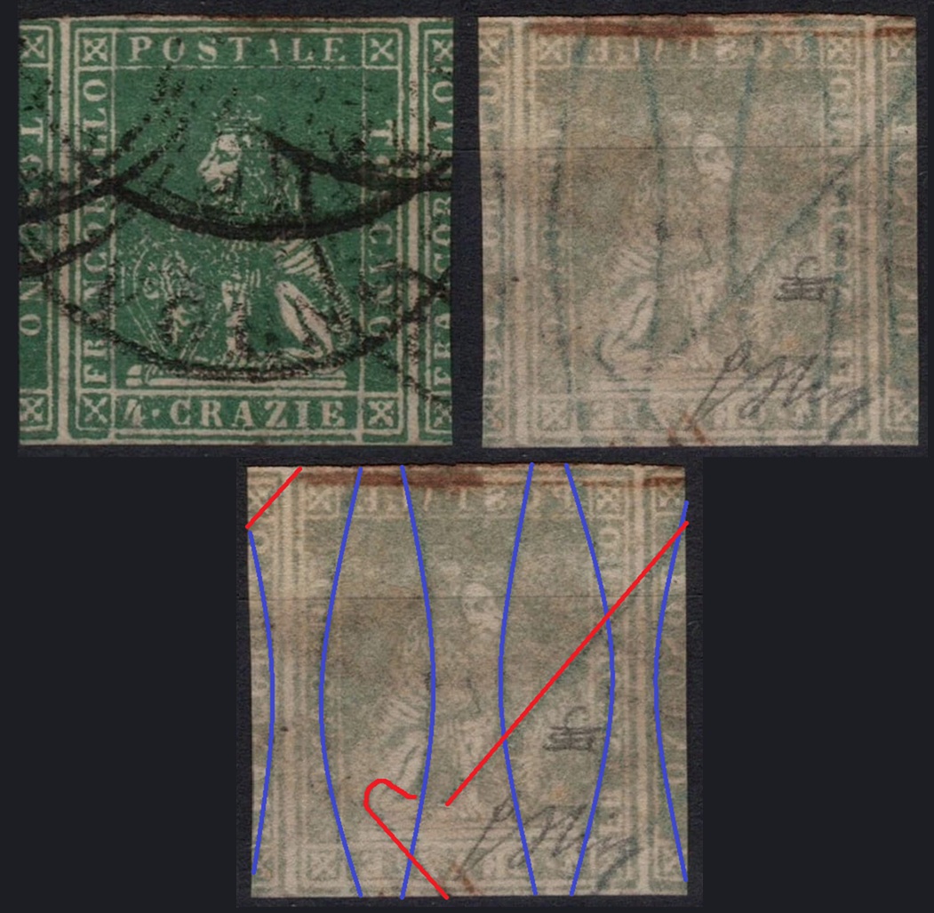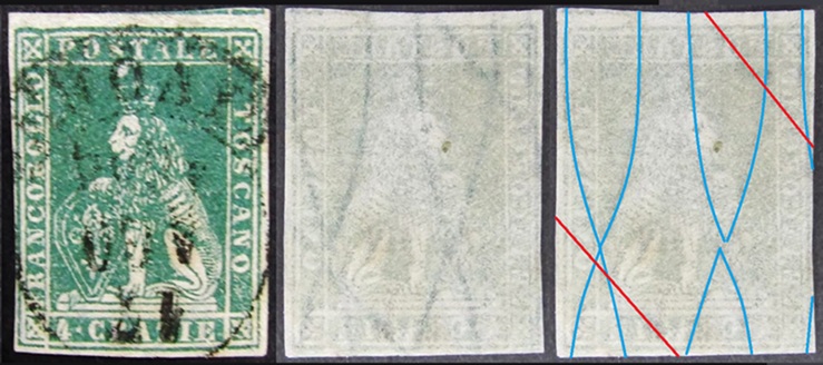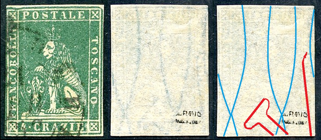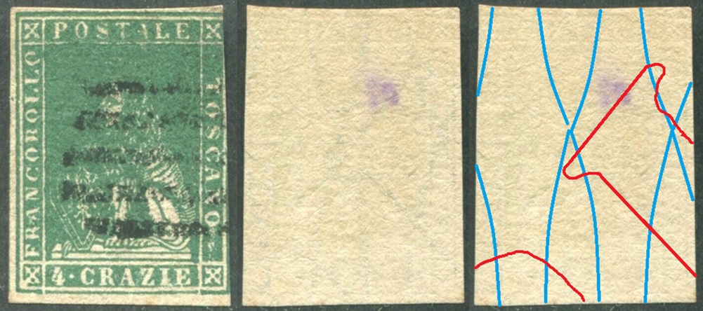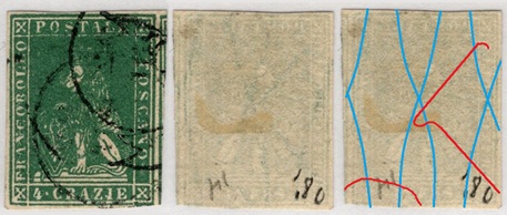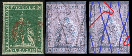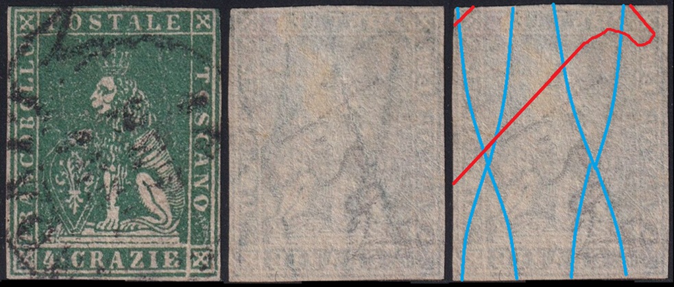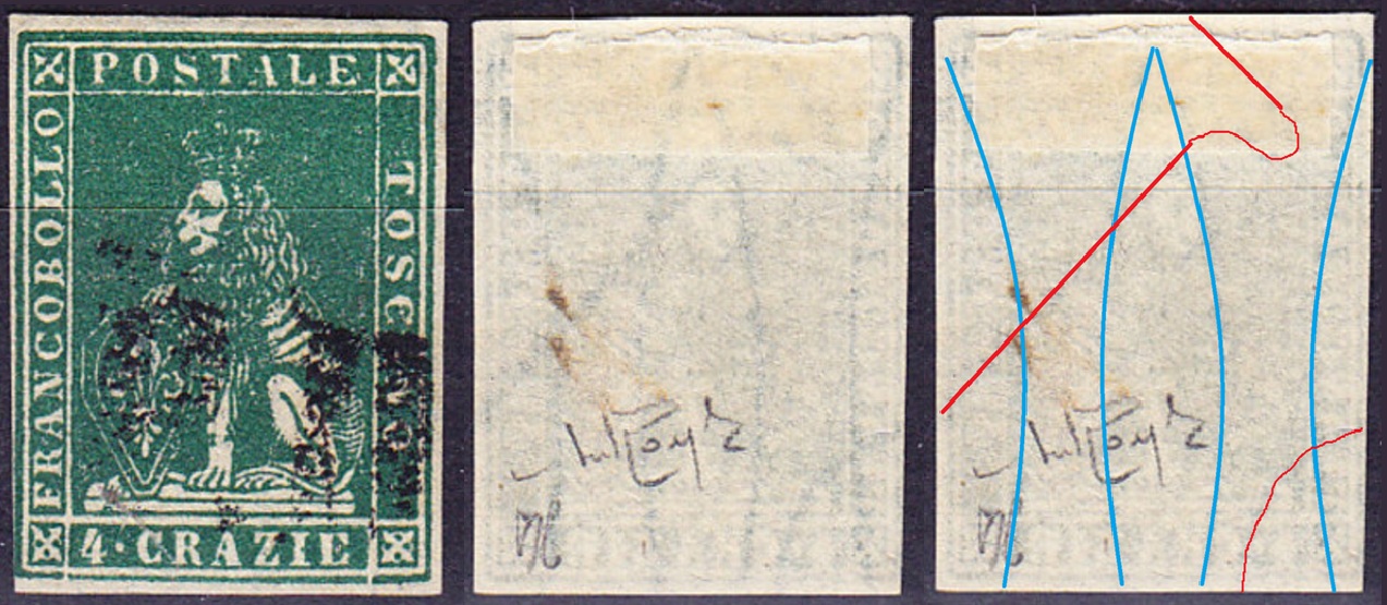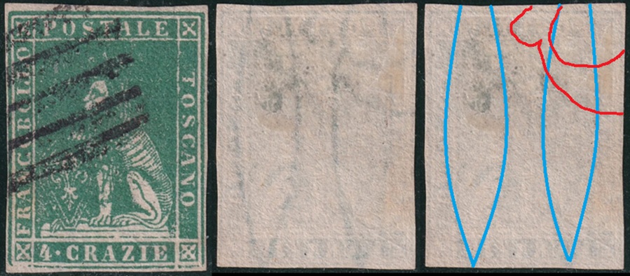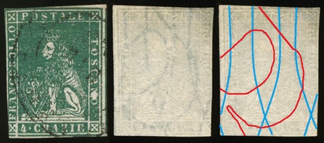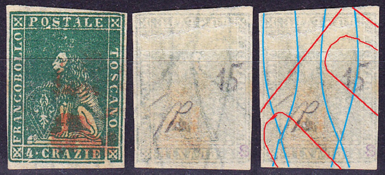 Dopo la pubblicazione della sezione relativa ai valori da 1 quattrino (1QII), da 1 soldo (1SII), da 1 crazia (1CrII) e da 2 crazie (2CrII), proseguiamo la presentazione dell'archivio dei Francobolli Granducali su Seconda Filigrana del tipo fil-let, riportando gli esemplari del valore da 4 crazie che siamo riusciti a reperire fino ad oggi. Per ogni francobollo riporteremo una parte descrittiva composta dal numero di archivio preceduto dal carattere #, seguito dalla sigla del francobollo, ovvero 1QII per il valore da 1 quattrino su Seconda Filigrana, 1SII per quello da 1 soldo su Seconda Filigrana, 1CrII per i valori da 1 crazia su Seconda Filigrana e analogamente per i valori da 2 crazie (2CrII), 4 crazie (4CrII), 6 crazie (6CrII) e 9 crazie (9CrII), seguito dalla configurazione della filigrana tra le quattro possibili (AS-BD, BD-AS, AD-BS e BS-AD), dalla posizione occupata dal francobollo nel quadro di stampa ed infine da un link che richiama una composizione grafica formata dalla sovrapposizione in trasparenza della filigrana del francobollo in esame e l'opportuna porzione della tavola di riferimento relativa alla configurazione della filigrana, come esemplificato nell'immagine che segue. Seguirà poi una parte grafica in cui mostriamo il francobollo affiancato dalla sua filigrana.