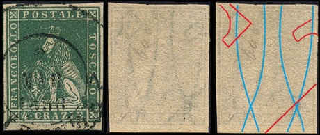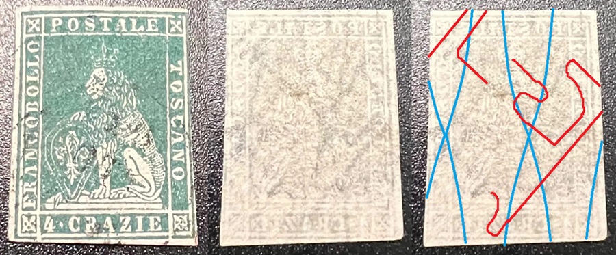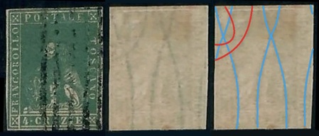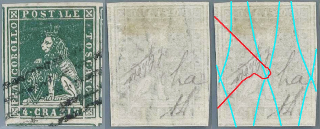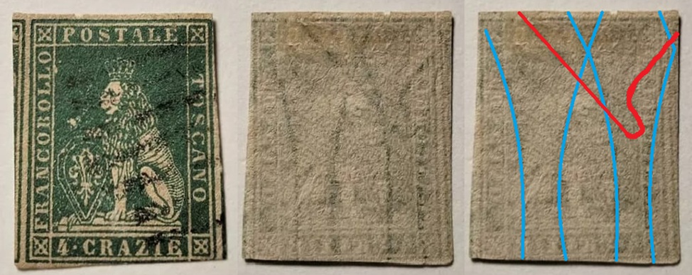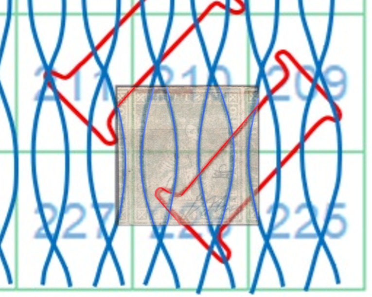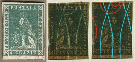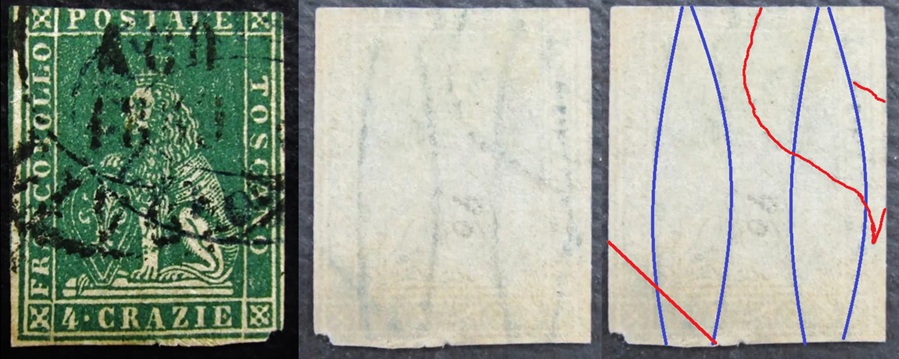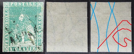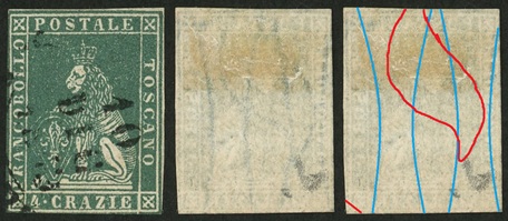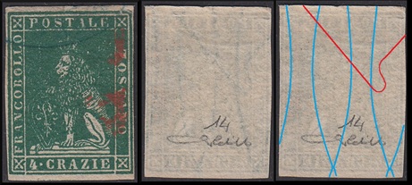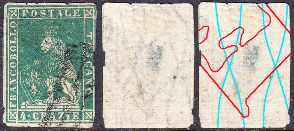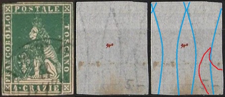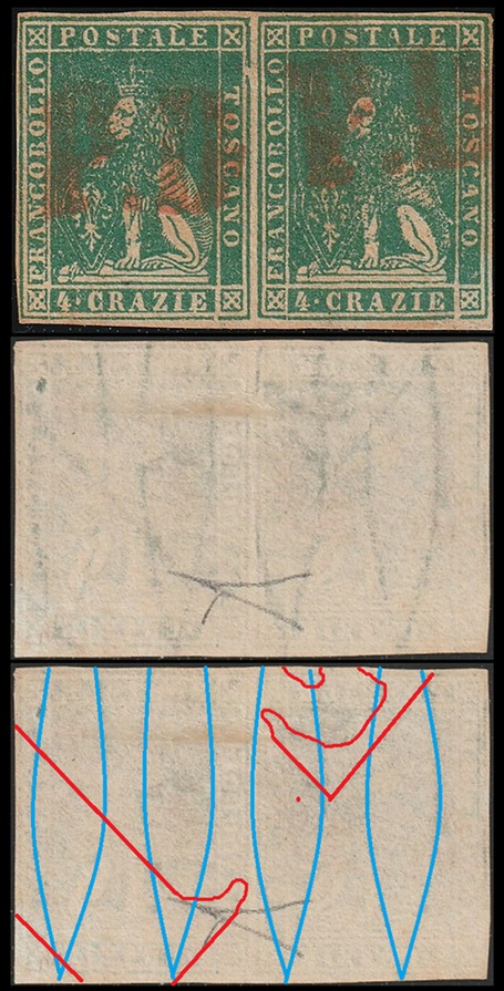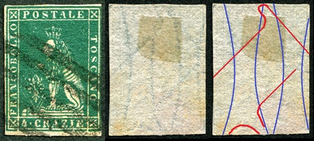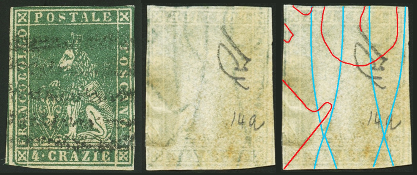 Dopo la pubblicazione della sezione relativa ai valori da 1 quattrino (1QII), da 1 soldo (1SII), da 1 crazia (1CrII) e da 2 crazie (2CrII), proseguiamo la presentazione dell'archivio dei Francobolli Granducali su Seconda Filigrana del tipo fil-let, riportando gli esemplari del valore da 4 crazie che siamo riusciti a reperire fino ad oggi. Per ogni francobollo riporteremo una parte descrittiva composta dal numero di archivio preceduto dal carattere #, seguito dalla sigla del francobollo, ovvero 1QII per il valore da 1 quattrino su Seconda Filigrana, 1SII per quello da 1 soldo su Seconda Filigrana, 1CrII per i valori da 1 crazia su Seconda Filigrana e analogamente per i valori da 2 crazie (2CrII), 4 crazie (4CrII), 6 crazie (6CrII) e 9 crazie (9CrII), seguito dalla configurazione della filigrana tra le quattro possibili (AS-BD, BD-AS, AD-BS e BS-AD), dalla posizione occupata dal francobollo nel quadro di stampa ed infine da un link che richiama una composizione grafica formata dalla sovrapposizione in trasparenza della filigrana del francobollo in esame e l'opportuna porzione della tavola di riferimento relativa alla configurazione della filigrana, come esemplificato nell'immagine che segue. Seguirà poi una parte grafica in cui mostriamo il francobollo affiancato dalla sua filigrana.