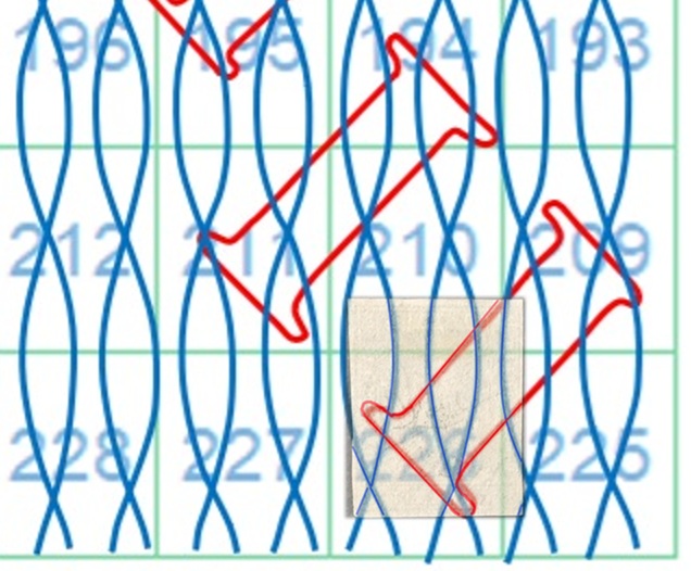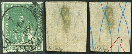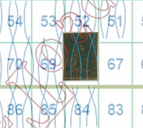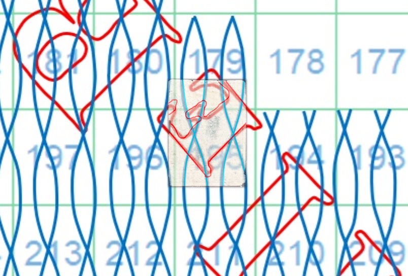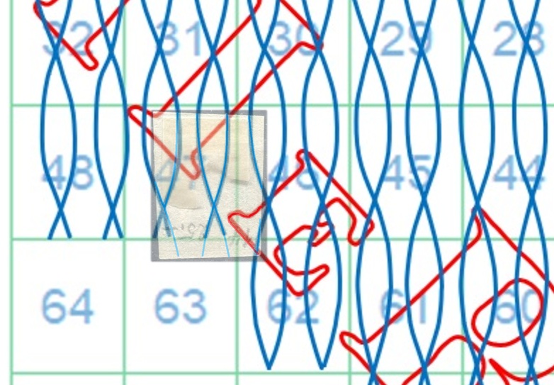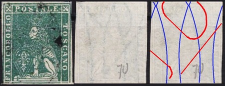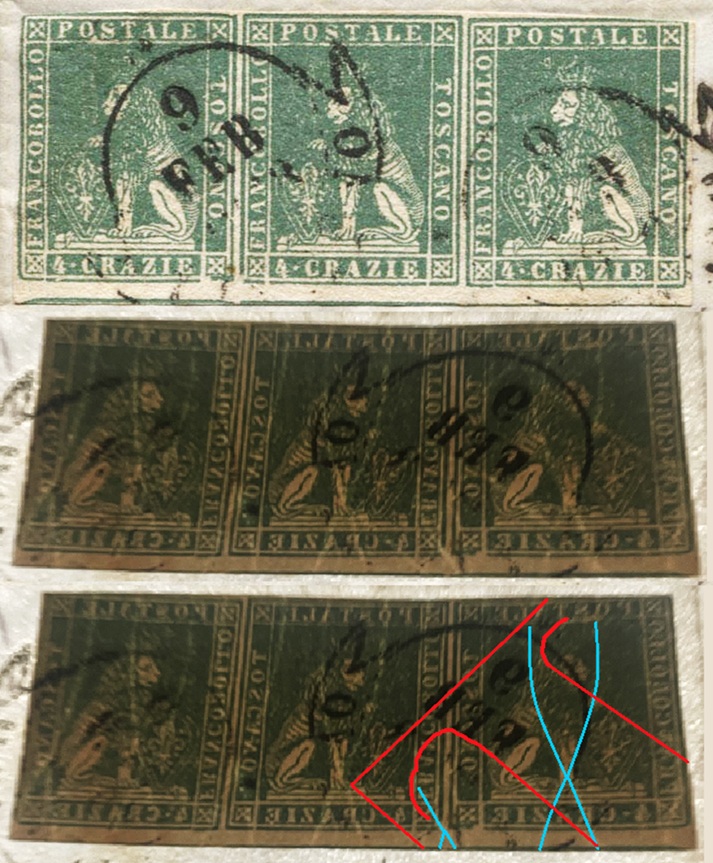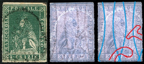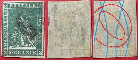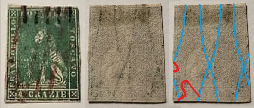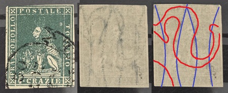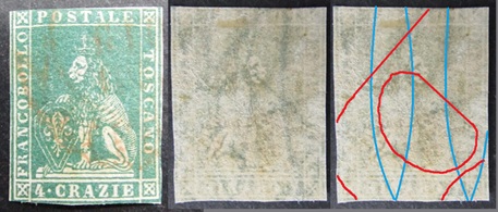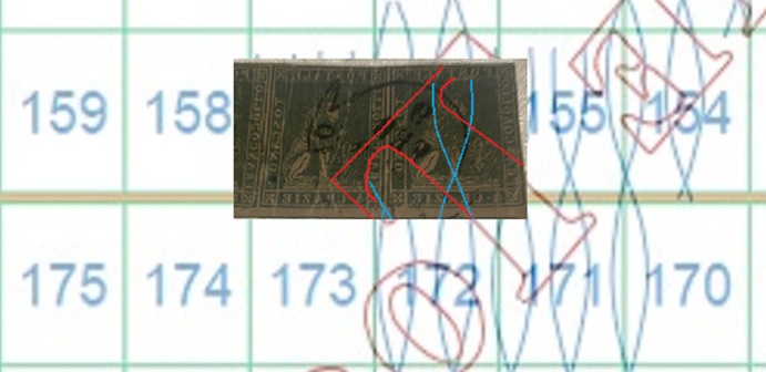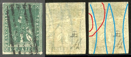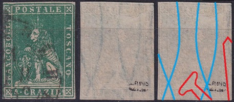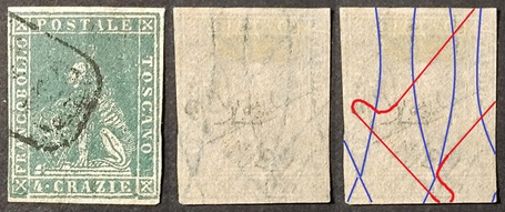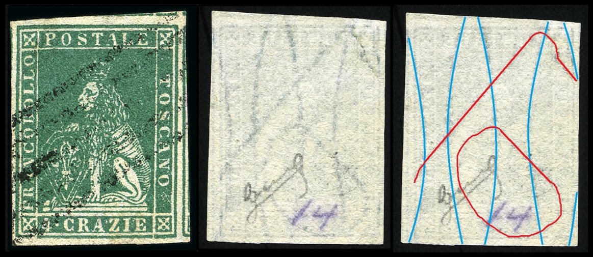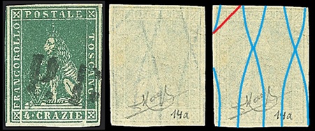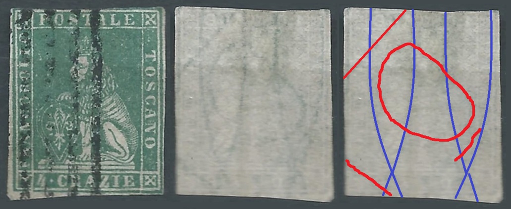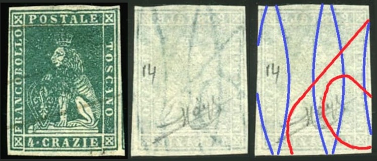 Dopo la pubblicazione della sezione relativa ai valori da 1 quattrino (1QII), da 1 soldo (1SII), da 1 crazia (1CrII) e da 2 crazie (2CrII), proseguiamo la presentazione dell'archivio dei Francobolli Granducali su Seconda Filigrana del tipo fil-let, riportando gli esemplari del valore da 4 crazie che siamo riusciti a reperire fino ad oggi. Per ogni francobollo riporteremo una parte descrittiva composta dal numero di archivio preceduto dal carattere #, seguito dalla sigla del francobollo, ovvero 1QII per il valore da 1 quattrino su Seconda Filigrana, 1SII per quello da 1 soldo su Seconda Filigrana, 1CrII per i valori da 1 crazia su Seconda Filigrana e analogamente per i valori da 2 crazie (2CrII), 4 crazie (4CrII), 6 crazie (6CrII) e 9 crazie (9CrII), seguito dalla configurazione della filigrana tra le quattro possibili (AS-BD, BD-AS, AD-BS e BS-AD), dalla posizione occupata dal francobollo nel quadro di stampa ed infine da un link che richiama una composizione grafica formata dalla sovrapposizione in trasparenza della filigrana del francobollo in esame e l'opportuna porzione della tavola di riferimento relativa alla configurazione della filigrana, come esemplificato nell'immagine che segue. Seguirà poi una parte grafica in cui mostriamo il francobollo affiancato dalla sua filigrana.