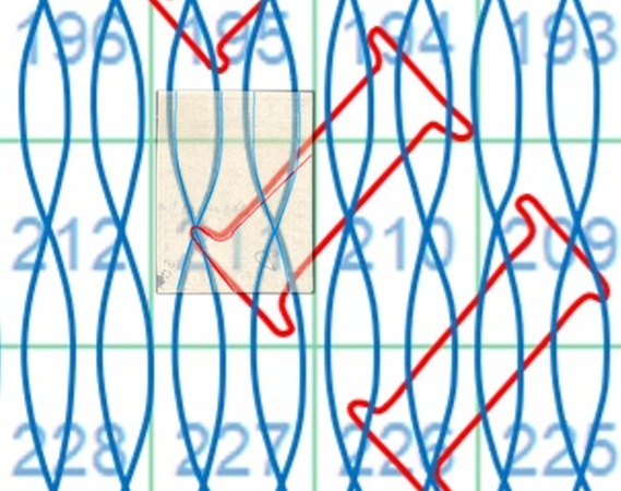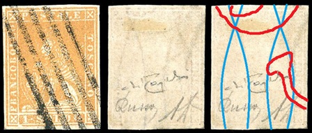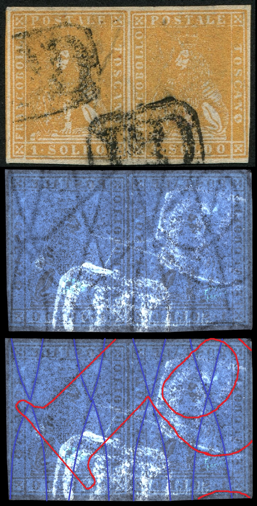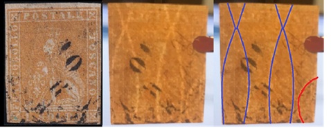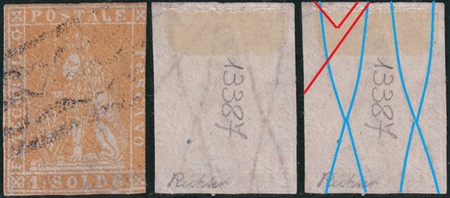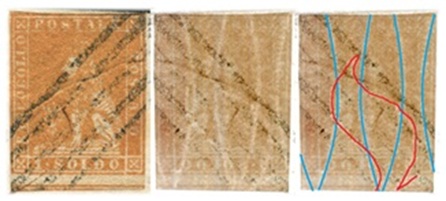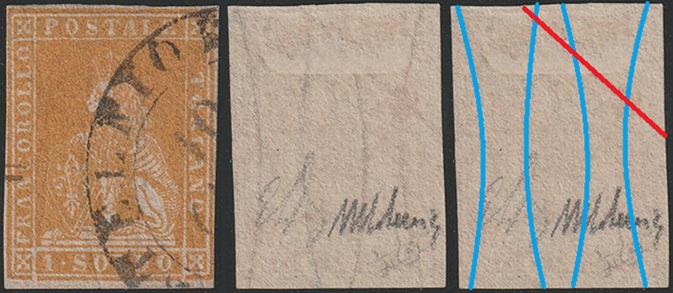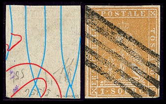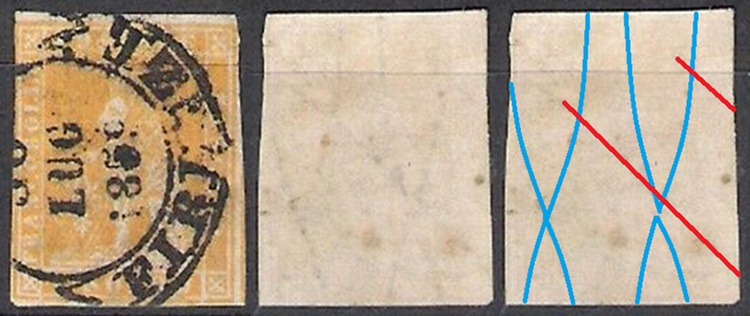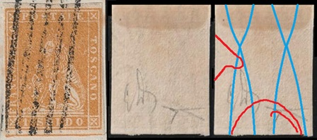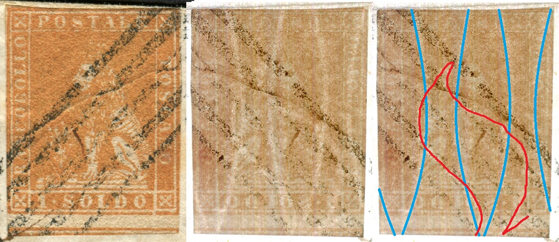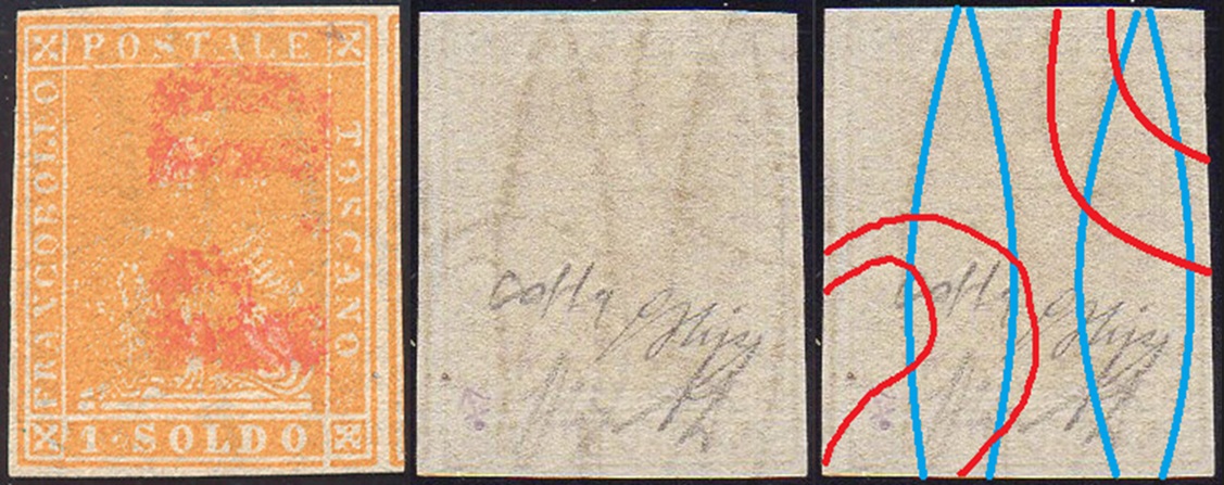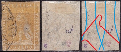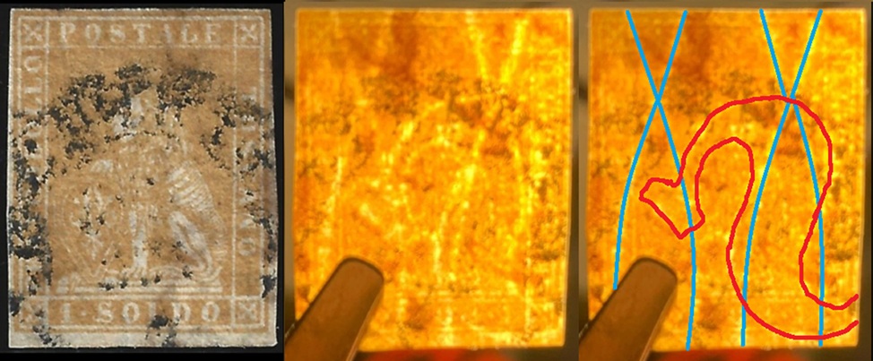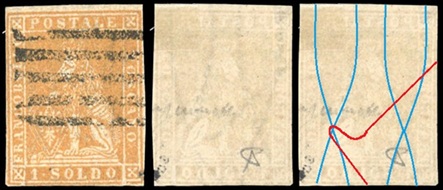 Dopo la pubblicazione della sezione relativa ai valori da 1 quattrino (1QII), proseguiamo la presentazione dell'archivio dei Francobolli Granducali su Seconda Filigrana del tipo fil-let, riportando gli esemplari del valore da 1 soldo che siamo riusciti a reperire fino ad oggi. Per ogni francobollo riporteremo una parte descrittiva composta dal numero di archivio preceduto dal carattere #, seguito dalla sigla del francobollo, ovvero 1QII per il valore da 1 quattrino su Seconda Filigrana, 1SII per quello da 1 soldo su Seconda Filigrana, 1CrII per i valori da 1 crazia su Seconda Filigrana e analogamente per i valori da 2 crazie (2CrII), 4 crazie (4CrII), 6 crazie (6CrII) e 9 crazie (9CrII), seguito dalla configurazione della filigrana tra le quattro possibili (AS-BD, BD-AS, AD-BS e BS-AD), dalla posizione occupata dal francobollo nel quadro di stampa ed infine da un link che richiama una composizione grafica formata dalla sovrapposizione in trasparenza della filigrana del francobollo in esame e l'opportuna porzione della tavola di riferimento relativa alla configurazione della filigrana, come esemplificato nell'immagine che segue. Seguirà poi una parte grafica in cui mostriamo il francobollo affiancato dalla sua filigrana.