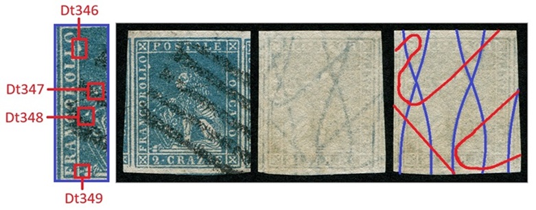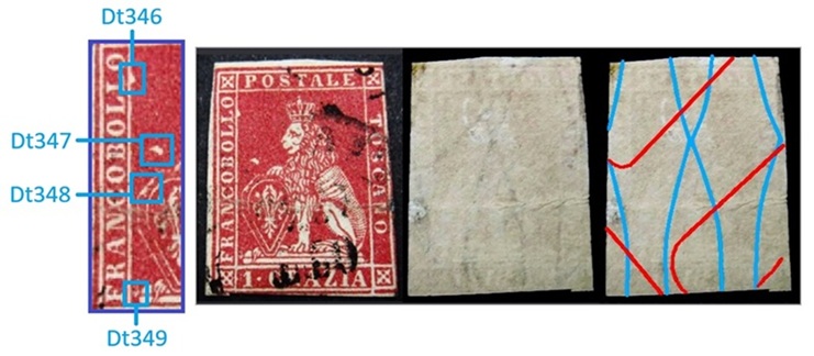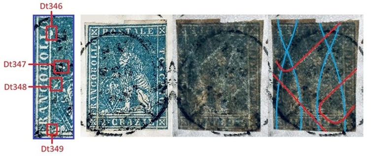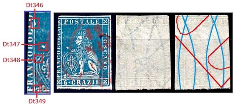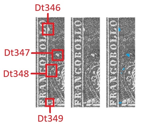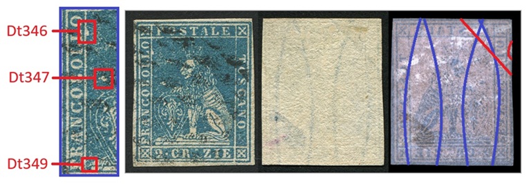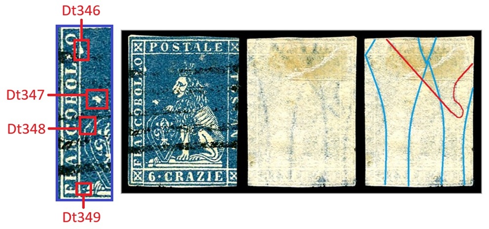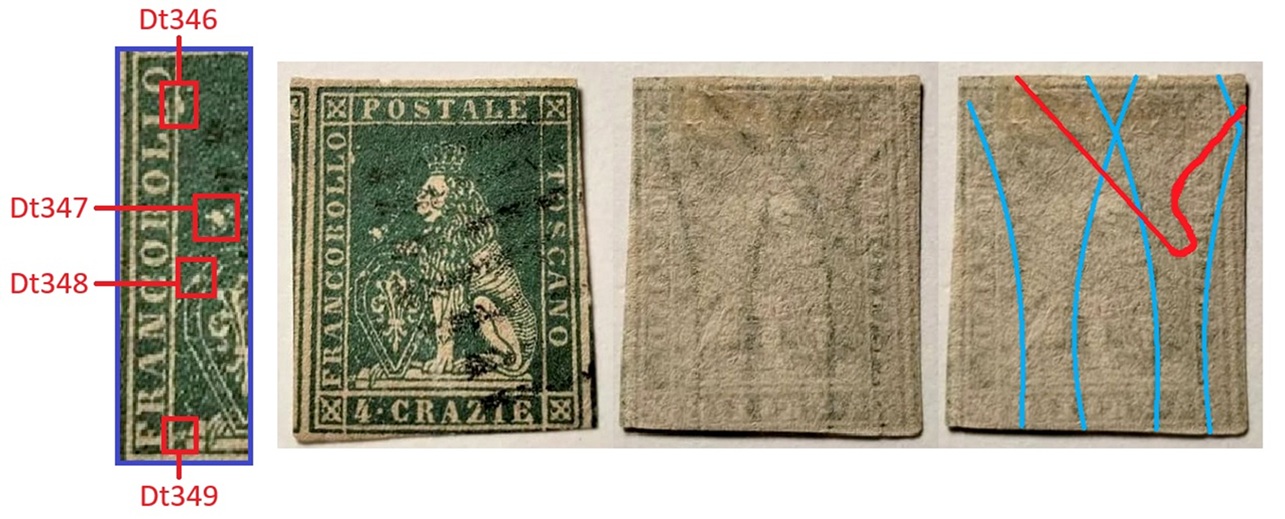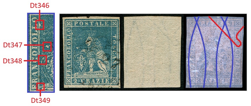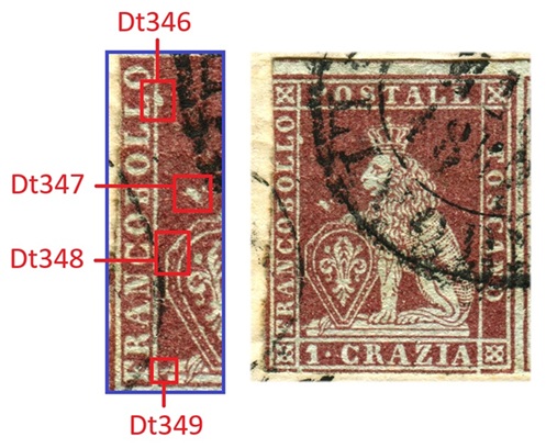 Questa varietà dello stereotipo della vignetta dei francobolli granducali di Toscana è caratterizzata da almeno quattro dettagli, tutti localizzati nel rettagnolo centrale che contiene il disegno del leone. Si tratta di quattro falle di colore, delle quali una localizzata sul lato sinistro del lato sinistro del grande rettangolo centrale, all'altezza del secondo carattere 'L' della Dicitura 1 (Dt346), una seconda posizionata sopra lo scudo all'altezza del carattere 'B' della Dicitura 1 (Dt347), una terza sulla cornice dello scudo, sul lato sinistro all'altezza del carattere 'C' sempre della Dicitura 1 (Dt348) ed una quarta in basso a sinistra che sembra congiungere il piedistallo su cui poggia il leone al lato sinistro del grande rettangolo, all'altezza del carattere 'F' della Dicitura 1 (Dt349), come abbiamo graficamente indicato in figura 1.