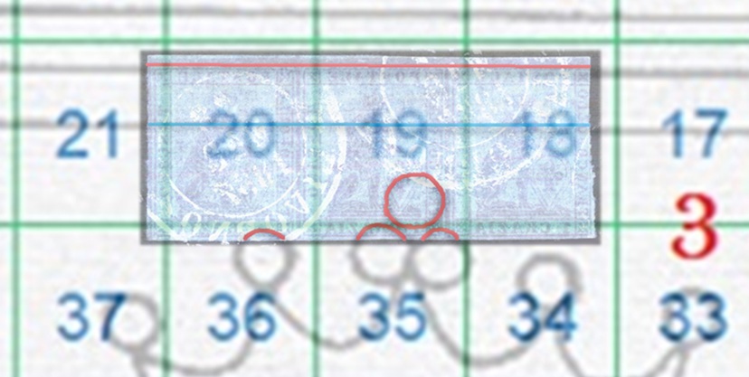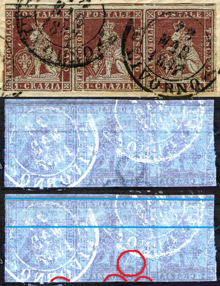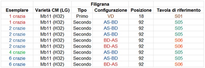 L'impronta della filigrana non è visibile al recto dei francobolli, quindi questa è del tipo Verso e la corona è chiaramente orientata verso l'alto (Dritta) per cui la configurazione della filigrana è del tipo VD, cosa che ci suggerisce di utilizzare la tavola di riferimento S01 per la ricerca della posizione che i francobolli occupavano nel quadro di stampa. Come dimostrato in figura 4 le tracce che si intravedono nella filigrana della strisica appartengono alla Corona 3 e che le posizioni occupate in origine dai frandobolli sono le 18, 19 e 20. In particolare, il francobollo nella varietà Mb11 (H32) occupava la posizione 18.