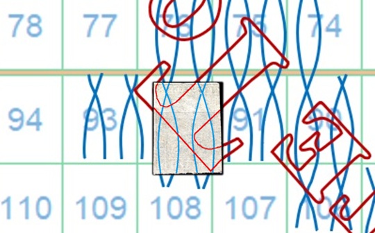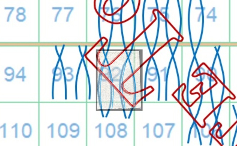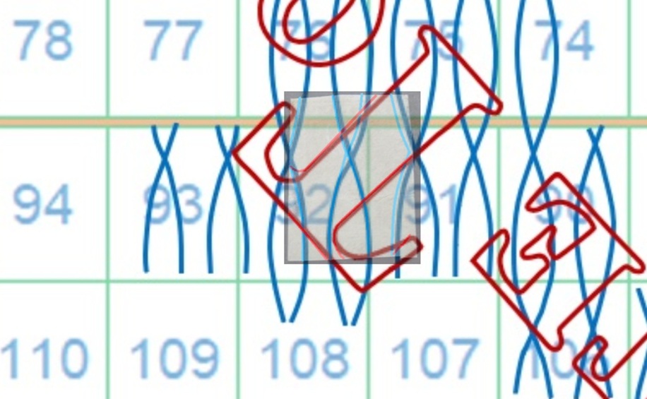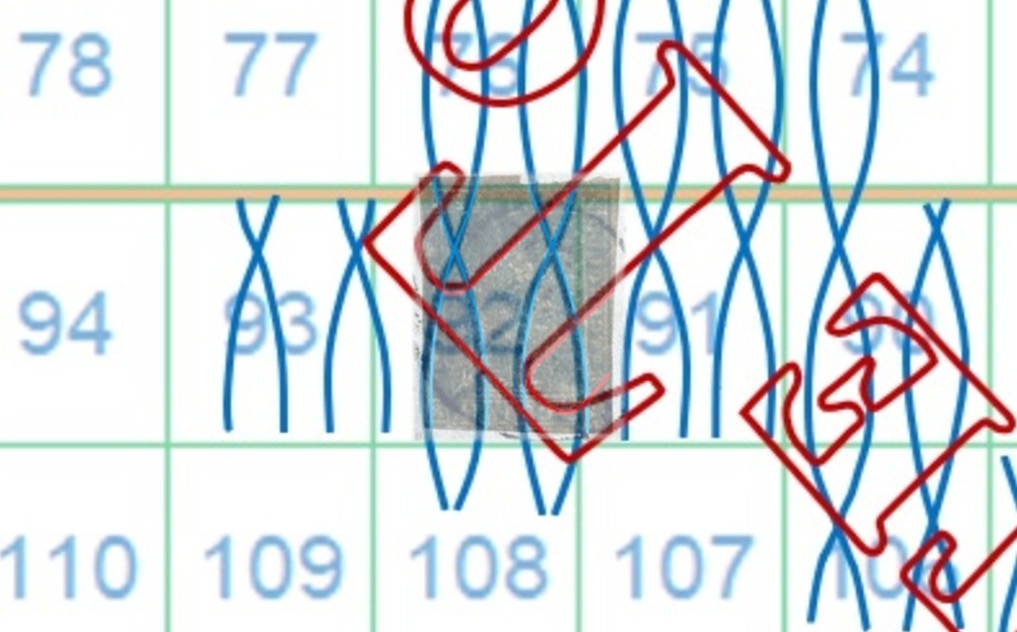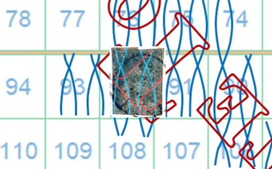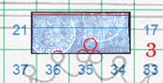 La filigrana mostra la parte alta del carattere 'T' della dicitura 'II E RR POSTE TOSCANE', tipologia che abbiamo già denominato Testa di 'T'. La configurazione della filigrana è del tipo BD-AS e grazie al confronto con la tavola di riferimento S06 risaliamo alla posizione occupata dal francobollo nel quadro di stampa, ovvero la 92, come dimostrato nell'immagine di figura 7.