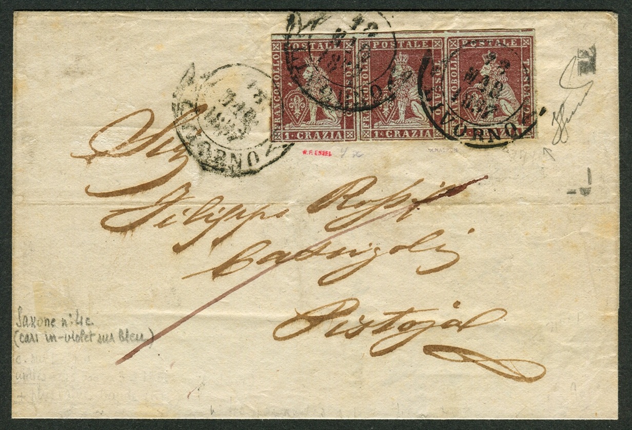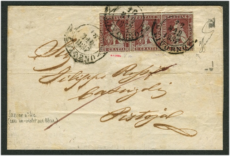 La striscia del valore da 1 crazia che abbiamo appena discusso, anullata in nero con tre impronte del datario circolare a banderuola di Livorno, affranca una sovracoperta di lettera che fu spedita dalla città costiera toscana a Pistoia il 18 di Marzo del 1857, dove arrivò il giorno successivo. La missiva era destinata al famoso commerciante e banchiere pistoiese Sig. Filippo Rossi Cassigoli (1835-1890).