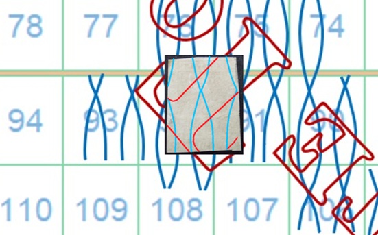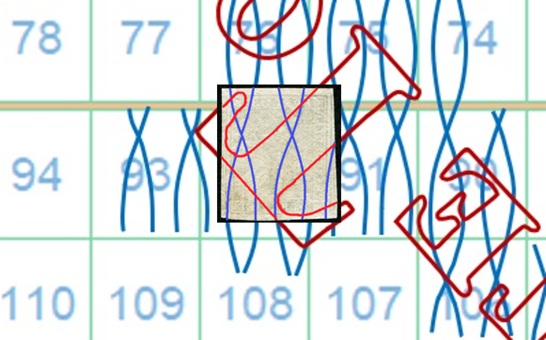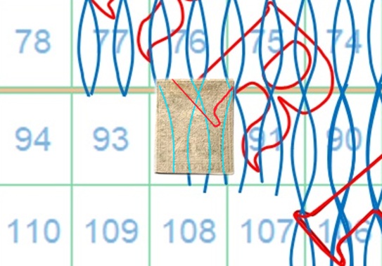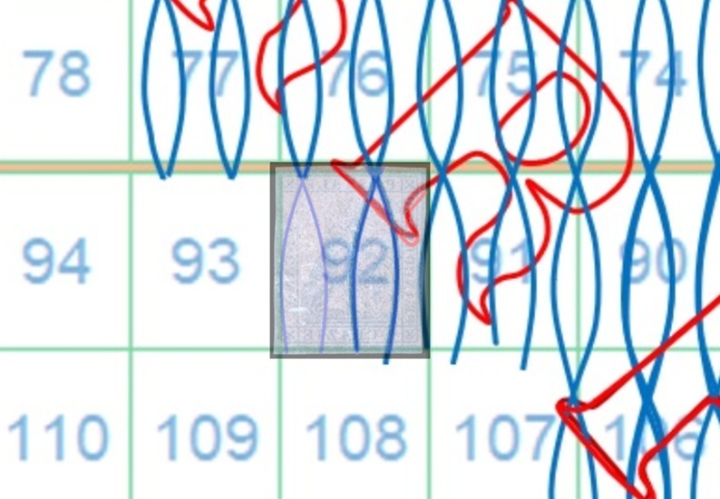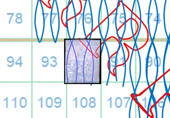 Anche in questo caso la filigrana mostra tracce del piede posteriore del secondo carattere 'R' della dicitura 'II E RR POSTE TOSCANE' e la configurazione è AS-BD. Sempre utillizzando la tavola di riferimento S05 risaliamo quindi alla posizione 92 che il francobollo occupava nel quadro di stampa (figura 13).