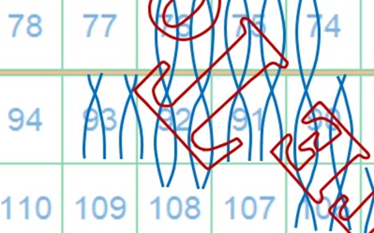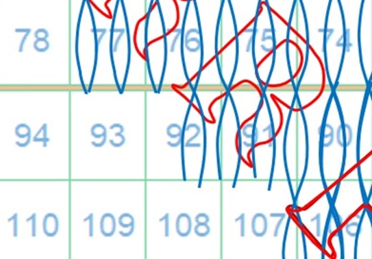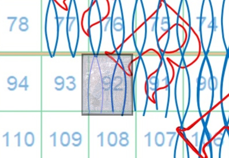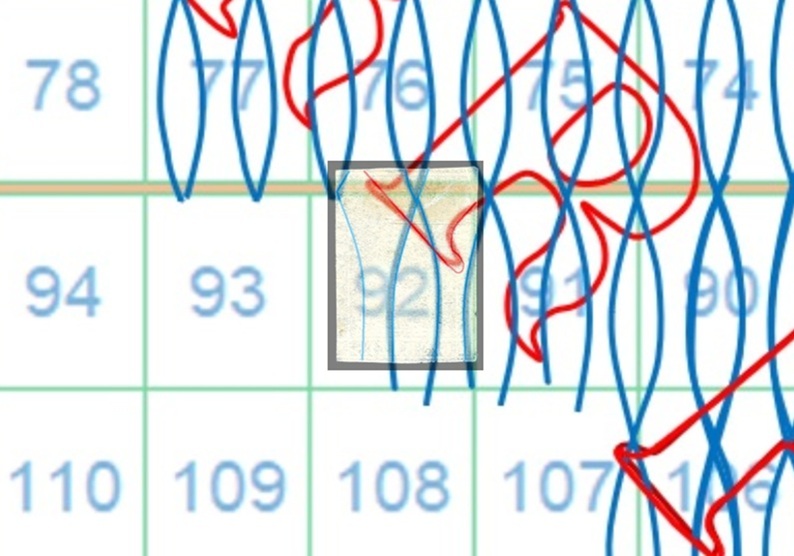 In questo caso la filigrana mostra tracce del piede posteriore del secondo carattere 'R' della dicitura 'II E RR POSTE TOSCANE' e la configurazione è AS-BD. Utillizzando la tavola di riferimento S05 risaliamo alla posizione 92 occupata dal francobollo nel quadro di stampa (figura 11).