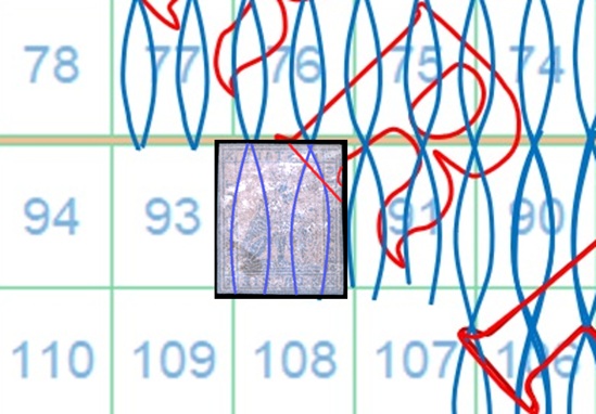 In questo caso la filigrana torna ad essere del tipo Testa di 'T' e la configurazione la BD-AS, quindi utilizzando la tavola di riferimento S06 risaliamo alla posizione 92 occupata dal francobollo nel quadro di stampa (figura 15).