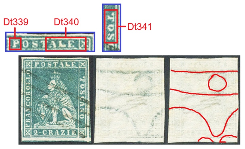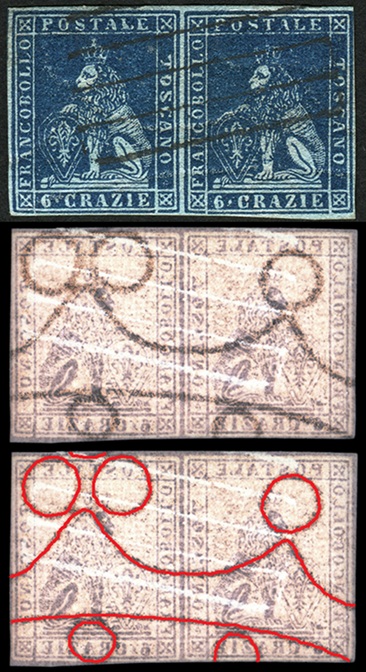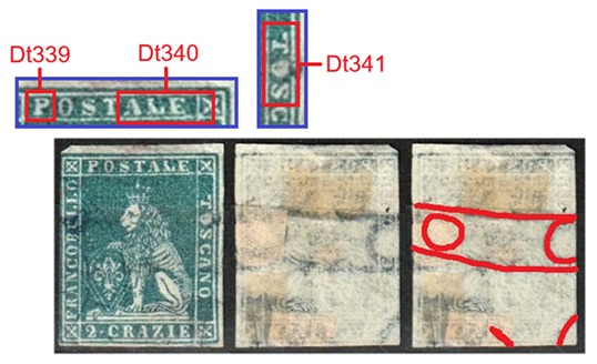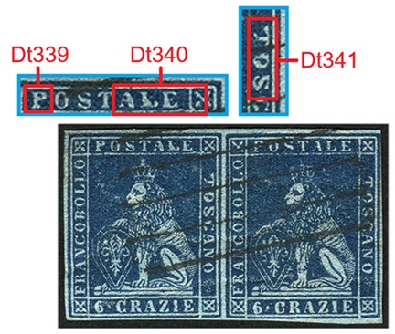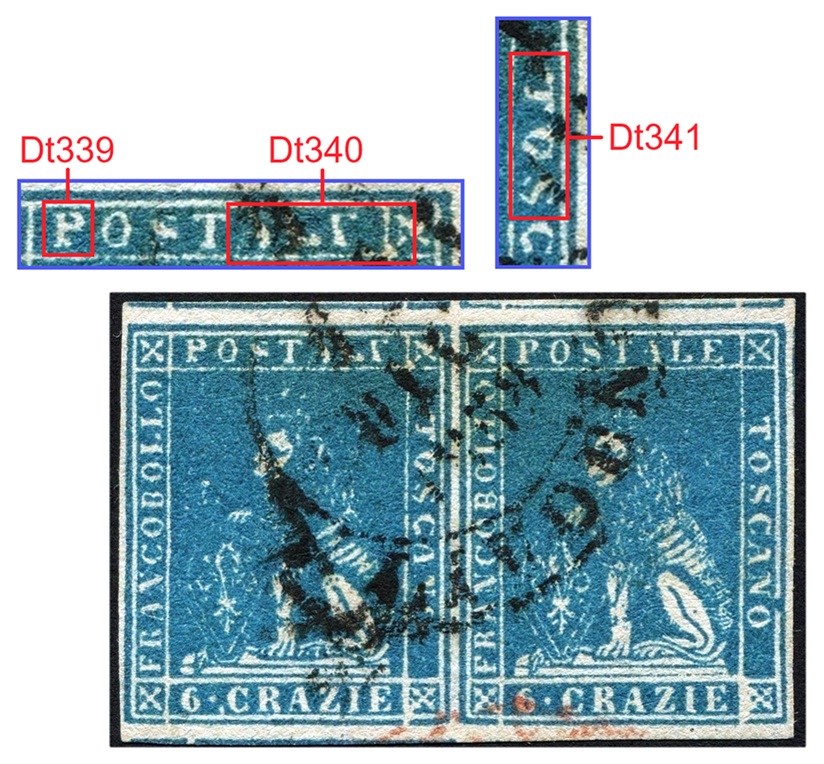 Nella figura 3 che segue riportiamo una coppia orizzontale del valore da 6 crazie su filigrana del Secondo Tipo, annullata in nero con un bollo datario circolare a banderuola di Livorno nel Dicembre del 1858 e con tracce di un bollo di transito internazionale in rosso. Il francobollo di sinistra della coppia è nella varietà C16 (D18), come si deduce dai dettagli che la caratterizzano evidenziati in figura. Da notare anche in questo caso il punto di colore nel primo carattere 'O' della Dicitura 3.