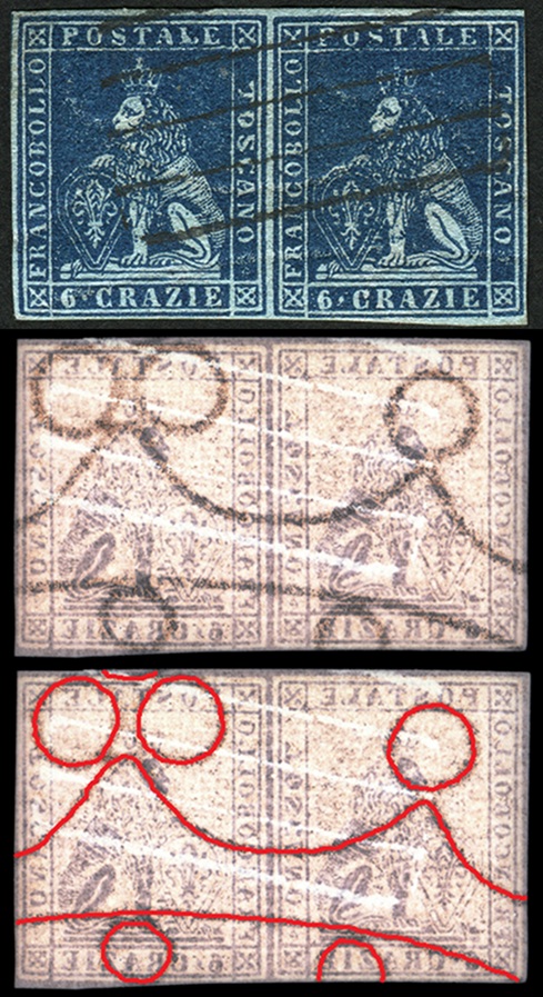 Per due delle strisce, che riproponiamo nelle figure 23 e 24, il margine superiore è in effetti ampio abbastanza da mostrare tracce degli esemplari che si trovavano nella riga superiore, la quinta, ma la distanza che separava questi dai francobolli della sesta riga risulta di molto inferiore a quella tipica di un interspazio di gruppo.