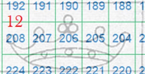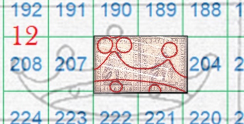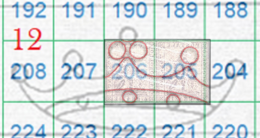 Come si può intravedere dalla scansione del recto della coppia, l'impronta della filigrana è visibile sul lato stampato, quindi siamo in presenza della configurazione Recto e vista l'orientazione delle corone siamo anche nella configurazione Dritta (RD). I tratti curvilinei che vediamo nella filigrana appartengono alla Corona 12, quindi utilizzando la tavola di riferimento S03 otteniamo che le posizioni occupate dai francobolli nel quadro di stampa erano le 205 e 206, come dimostrato nella figura 6 che segue.