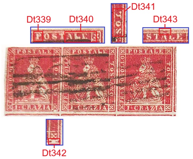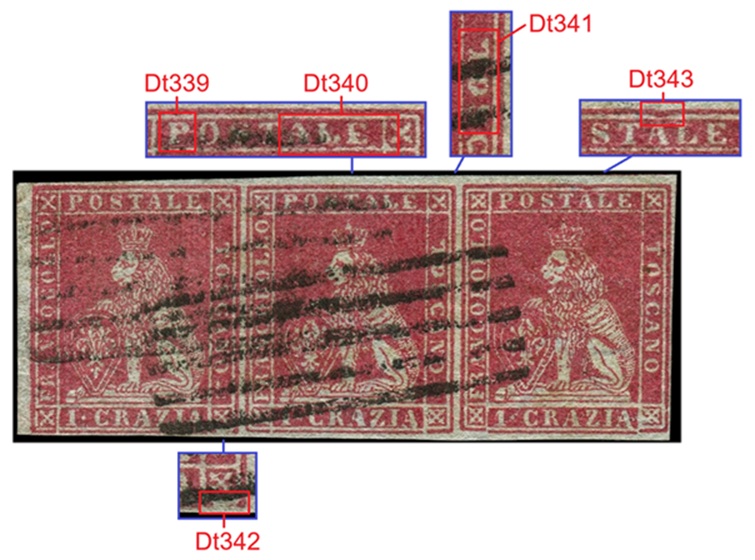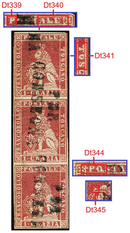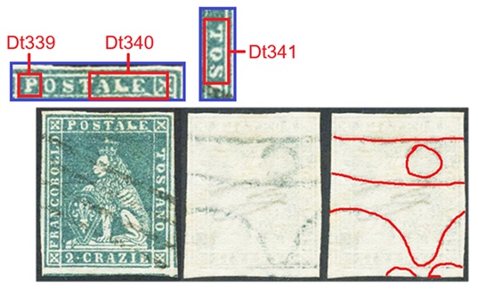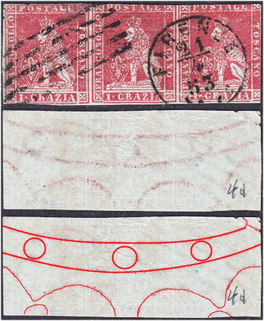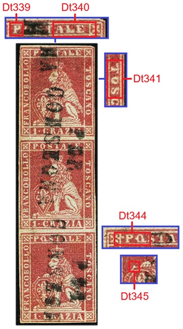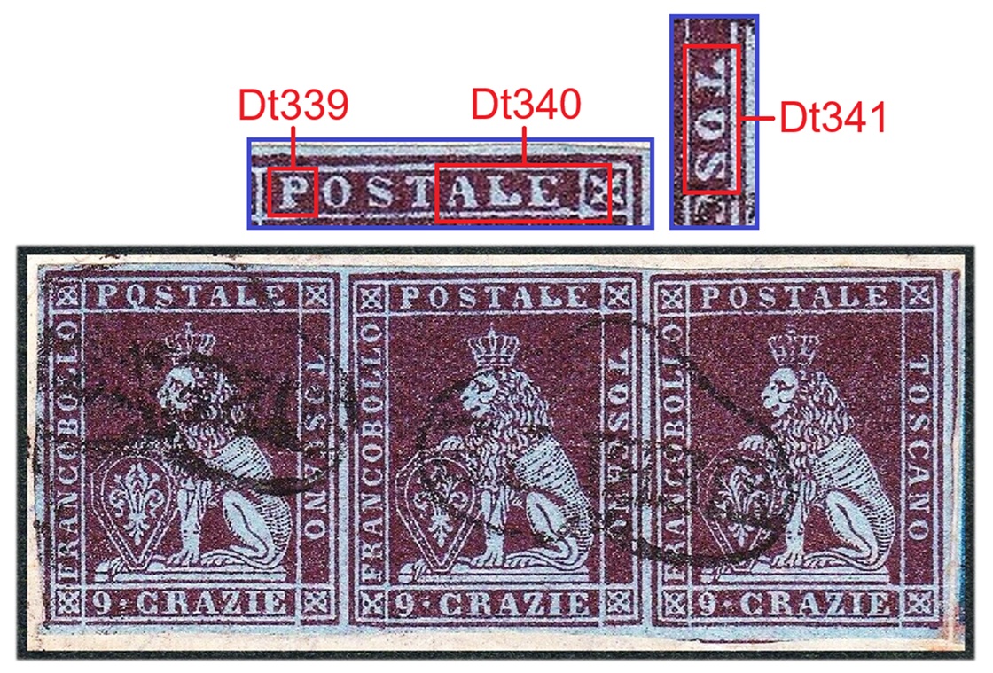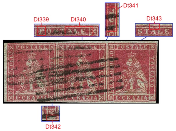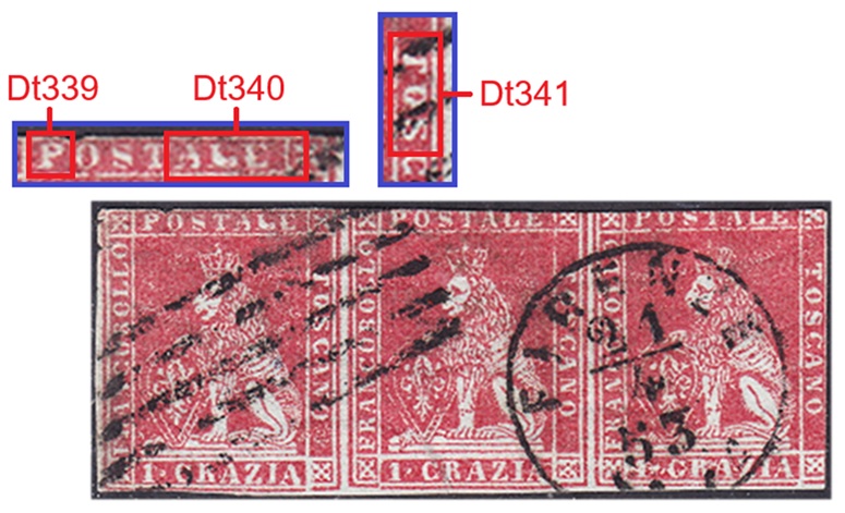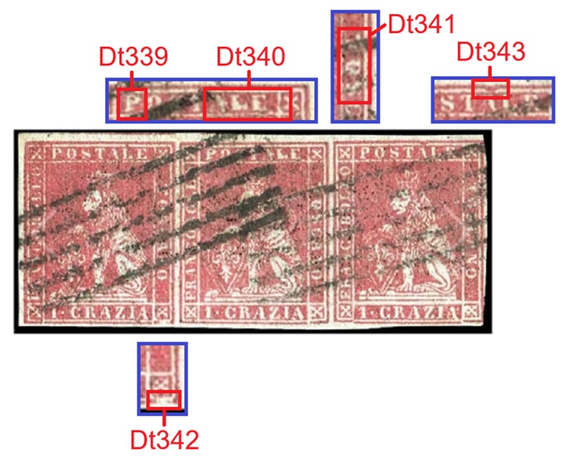 In figura 11 che segue riportiamo un multiplo orizzontale di tre esemplari del valore da 1 crazia su filigrana del Primo Tipo, annullata in nero con due impronte di un muto a cinque barre. I tre francobolli presentano tutti una varietà dello stereotipo della vignetta, le stesse descritte in precedenza. Nel francobollo di sinistra osserviamo il dettaglio Dt342, interruzione del Segmento 5 della cornice esterna, che abbiamo assegnato alla varietà F1 (G9). Il francobollo centrale è stato stampato con lo stereotipo della vignetta nella varietà C16 (D18), come evidenziato dalla presenza dei dettagli Dt339, Dt430 e Dt341 chiaramente riconoscibili. Il francobollo di destra porta l'inconfondibile avvallamento del Segmento 3 della cornice esterna che abbiamo codificato come Dt343 che identifica lo stereotipo F17 (D10). Da notare il margine sinistro del pezzo di figura 11, particolarmente ampio e privo di stampa, che indica che i francobolli si trovavano al margine di foglio sinistro, ovvero giacenti rispettivamente nella prima, seconda e terza colonna delle sedici di cui era costituito il quadro di stampa.