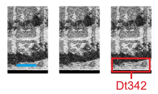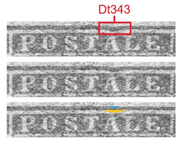 La varietà D1 (D11) è caratterizzata principalmente da quello che abbiamo denominato Dt344, ovvero una serie di quattro falle di colore distribuite a paratire dall'Ornato 2 fino al carattere 'O' della Dicitura 2, come abbiamo evidenziato nella figura 29 che segue.
