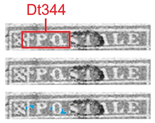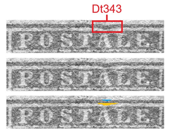 Questa varietà è caratterizzata da un'incurvatura verso il basso del Segmento 3 della cornice esterna del francobollo, ovvero quello orizzontale in alto, in corrispondenza del carattere 'A' della Dicitura 2 (Dt343, figura 9).