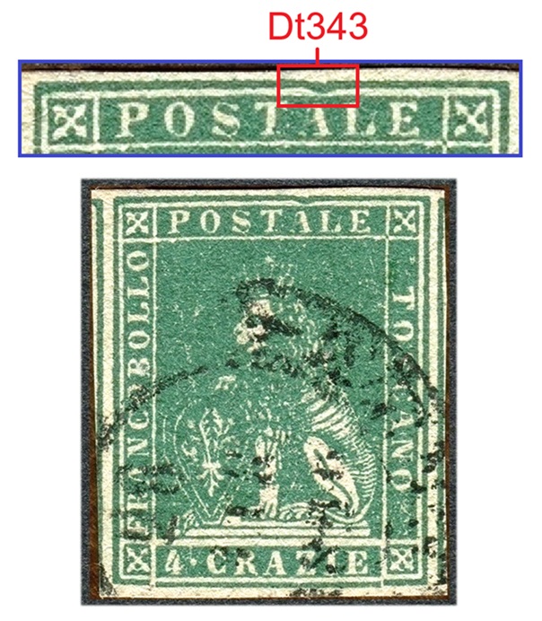 Nella figura 10 che segue riportiamo un esemplare del valore da 4 crazie su filigrana del Secondo Tipo dai margini molto ampi, annullato in modo leggero con un datario circolare a banderuola di Firenze, nella varietà F17 (D10), dove il dettaglio Dt343 che la caratterizza è perfettamente distinguibile.