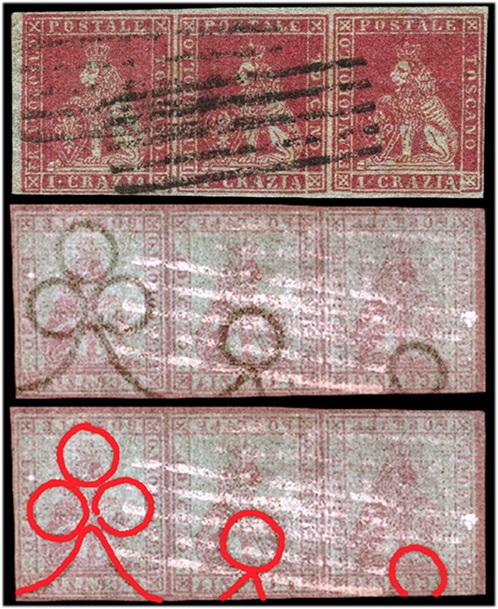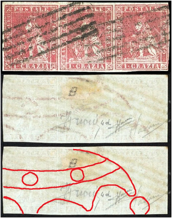 Nella figura 14 che segue riportiamo un secondo multiplo orizzontale sempre del valore da 1 crazia su filigrana del Primo Tipo, anche in questo caso annullata in nero con due impronte del muto a cinque barre, utilizzato per il pezzo precedente. Si osservi come i tre francobolli che costituiscono il multiplo presentino le stesse varietà dello stereotipo della vignetta della striscia discussa in precedenza, ovvero la F1 (G9) per il francobollo di sinistra, la C16 (D18) per il francobollo centrale e la F17 (D10) per quello di destra. Nell'immagine di figura 7 abbiamo cercato di evidenziare tutti i dettagli attraverso cui identificare le tre varietà. Anche in questo caso il margine a sinistra è ampio a sufficienza da poter localizzare la striscia a margine di foglio e anche la maggiore inchiostrazione che si osserva nella metà di sinistra del francobollo di sinistra ed in particolare quella che interessa il Segmento 2 della cornice esterna, tipico dei francobolli che si trovavano a margine di foglio, ce ne dà conferma.