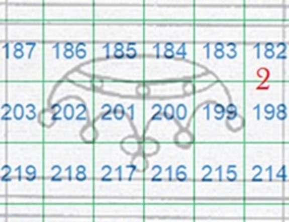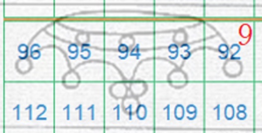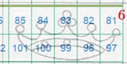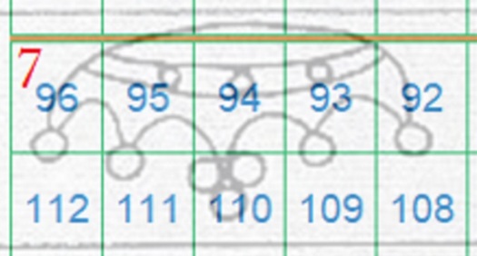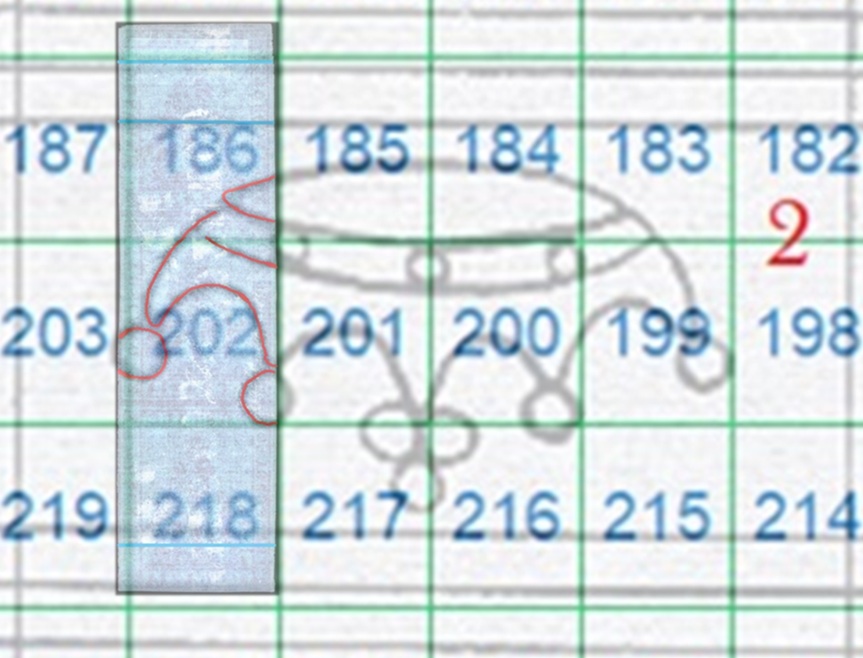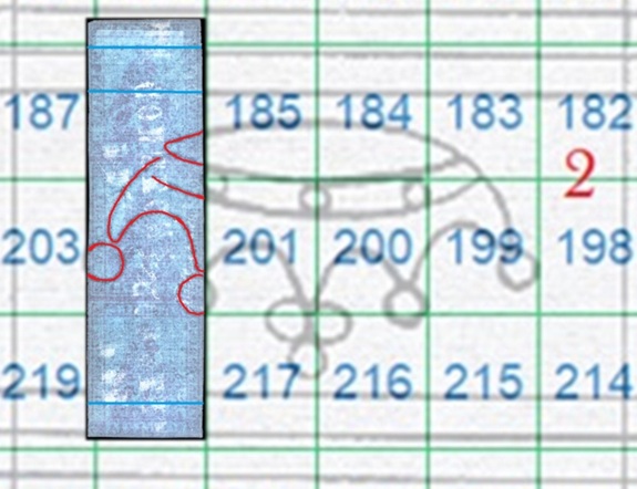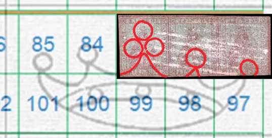 I tratti curvilinei che si vedono nella fiigrana appartengono alla Corona 2 della quale si vede gran parte di due delle perle apicali singole laterali. La configurazione della filigrana è del tipo Capovolta e l'impronta è al Verso (VC), quindi aiutandoci con la tavola di riferimento S02, ricaviamo la posizione che i francobolli occupavano nel quadro di stampa, ovvero le 186, 202 e 218, come mostrato nella figura 33 che segue.