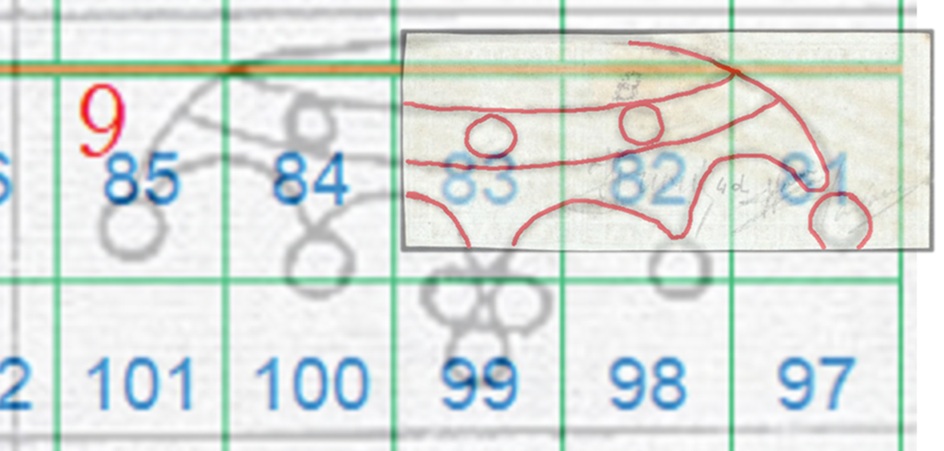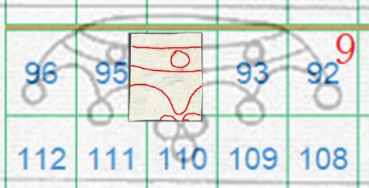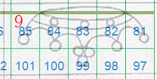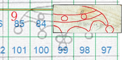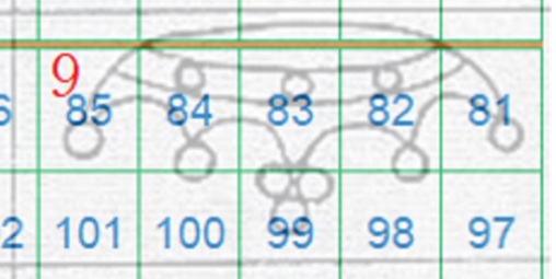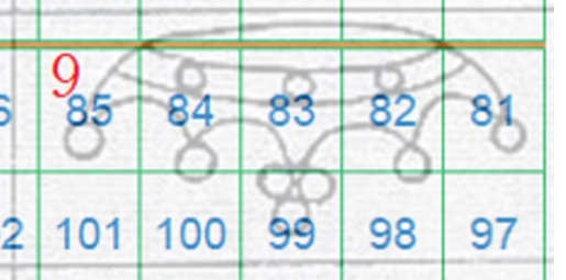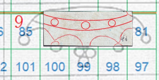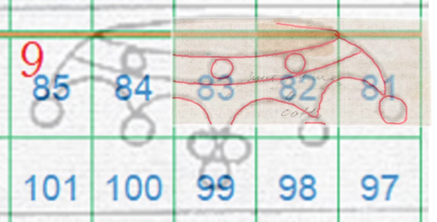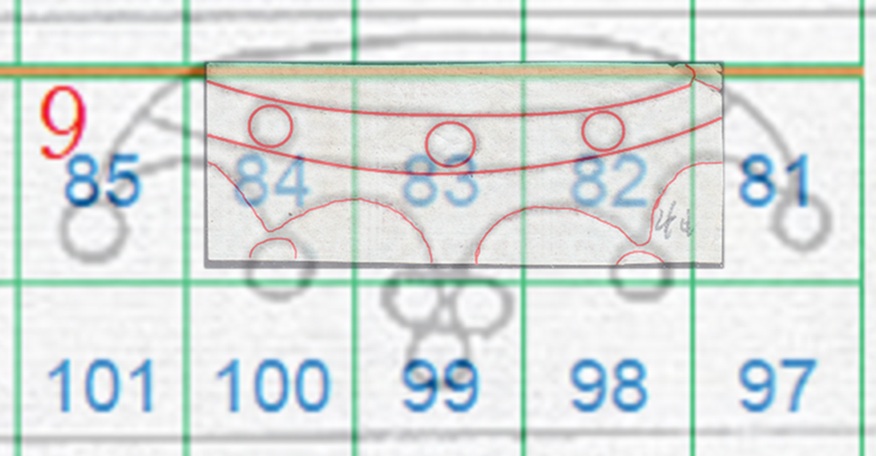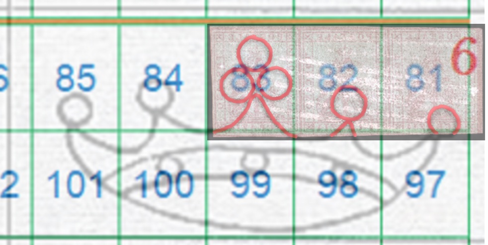 In questo caso la filigrana è in configurazione Capovolta, l'impronta è al Recto (fronte) e quindi del tipo RC. Le linee che si vedono appartengono alla Corona 9 e utilizzando la tavola di riferimento S04 ricaviamo come posizioni occupate dai francobolli nel quadro di stampa le 81, 82 e 83, come dimostrato nella figura 16 che segue.
