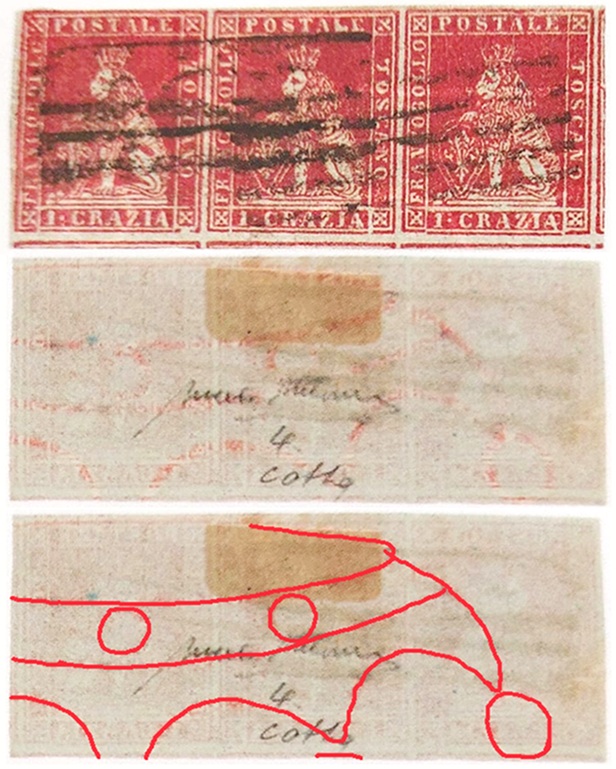 Nella figura 15 che segue riportiamo il verso di questa striscia orizzontale, assieme allo stesso dove abbiamo ritracciato in rosso le linee della filigrana.