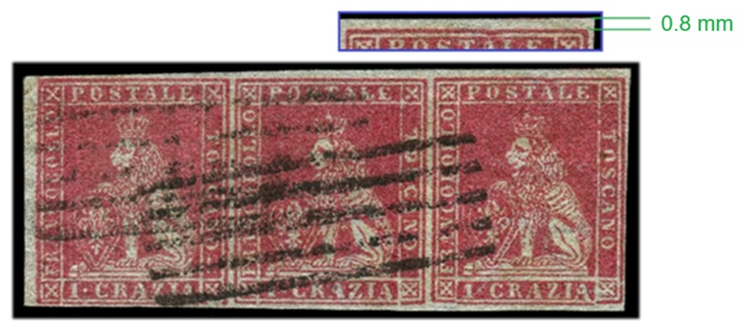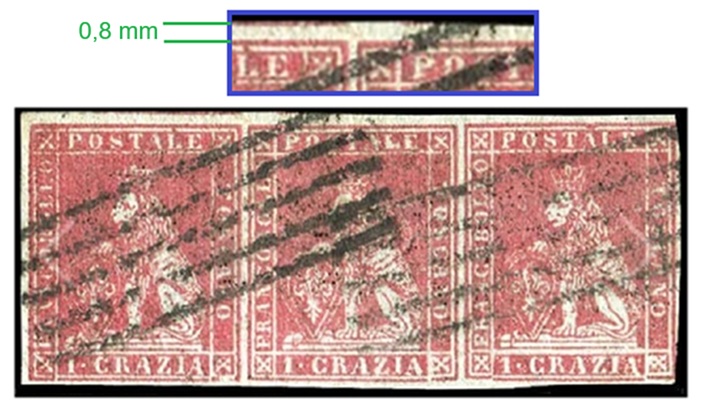 Fino ad ora abbiamo mostrato quattro multipli del valore da una grazia, che provenivano sempre dalla sesta riga dall'alto, ovvero adiacenti con il loro lato superiore all'Interspazio di Gruppo Superiore. I francobolli delle strisce dovrebbero quindi mostrare in alto, quando il margine fosse sufficientemente ampio, una porzione di carta non stampata di almeno 1,4 millimetri.