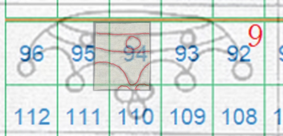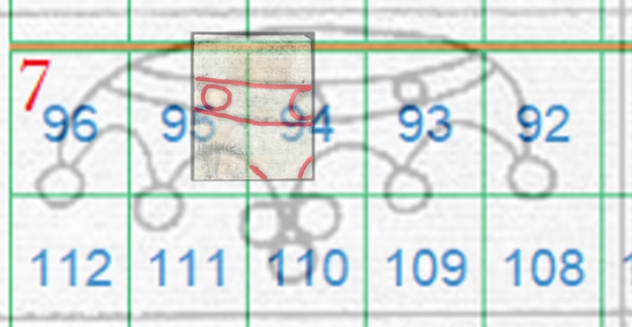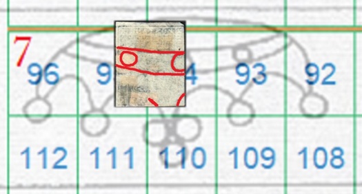 La filigrana è chiaramente in configurazione Capovolta, mostra due delle perle della ghiera orizzontale e tracce del collo centrale che porta al trittico apicale della Corona 7. In questo caso il confronto va effettuato con la tavola di riferimento S04, in quanto l'impronta della filigrana è al Recto (RC), dal quale si deriva che la posizione occupata dal francobollo nel quadro di stampa era ancora la 94, come dimostrato in figura 28.