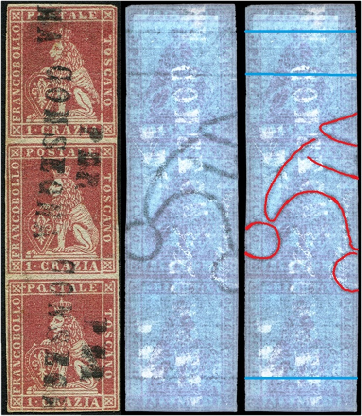 Un altro esempio della varietà C16 (D18) lo troviamo nel francobollo centrale del multiplo orizzontale che riportiamo in figura 7, dove anche in questo caso tutti i dettagli che caratterizzano la varietà sono perfettamente visibili. La striscia è ottimamente marginata, nella tinta di colore viola bruno scurissimo, la cosiddetta prugna, su carta colorata intensamente di azzurro e annullata con due impronte del bollo a cuore di Firenze capovolte.