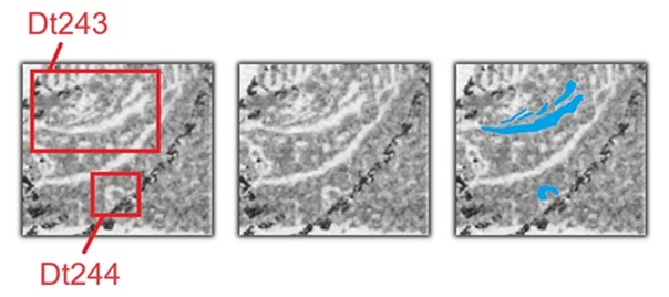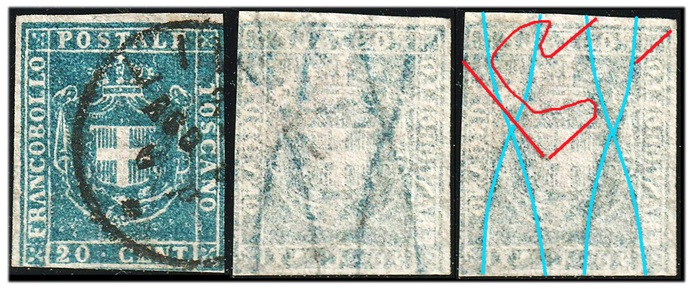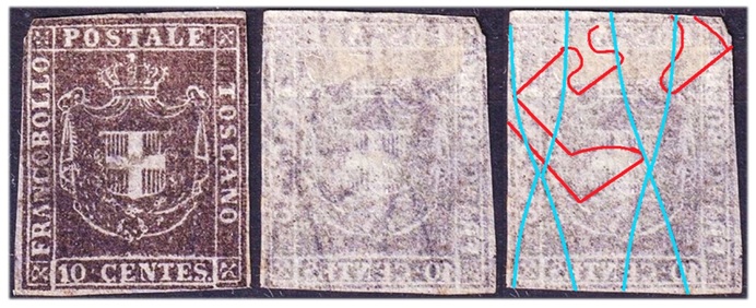 Abbiamo già descritto la varietà V-17 dei francobolli emessi dal Governo della Toscana in un precedente articolo. Questa è caratterizzata da due deformazioni principali che abbiamo denominato Dt243, ovvero una serie di graffi presenti in basso a destra dello stemma crociato dei Savoia all'interno del vessillo e Dt244, ovvero una piccola falla a forma di mezza luna localizzata in basso a destra subito all'esterno del perimetro inferiore del vessillo. Riportiamo in basso in figura 1 come appaiono questi elementi nei francobolli.
