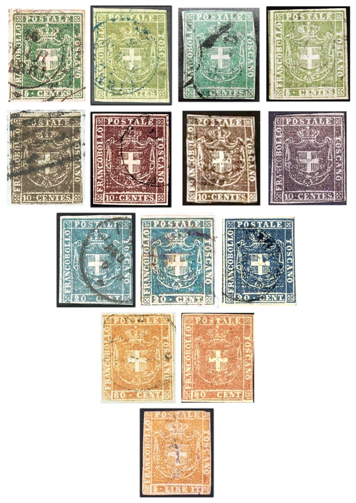 Al momento in cui presentammo per la prima volta questa varietà, avevamo raccolto solamente 4 esemplari di questo tipo. Ad oggi abbiamo riscontrato la varietà V-17 in 14 esemplari in 5 dei 7 valori emessi dal Governo della Toscana, ovvero del valore da 5 centesimi (4 esemplari), da 10 centesimi (4 esemplari), da 20 centesimi (3 esemplari), da 80 centesimi (2 esemplari) e da 3 Lire (1 esemplare). Questi francobolli sono riportati nella figura 2 che segue.