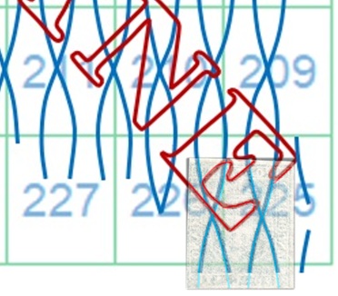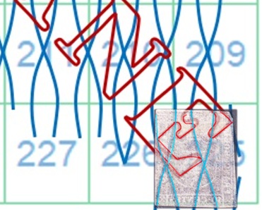 Confrontando quindi il pattern della filigrana con la tavola di riferimento S05, deduciamo che la posizione occupata dal francobollo nel quadro di stampa era la 225, come dimostrato in figura 4. Questa particolare posizione riguardo alla filigrana è quella che abbiamo denominato Angolo di foglio 'e'.