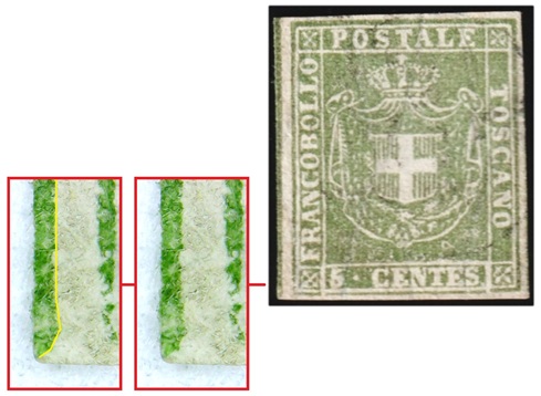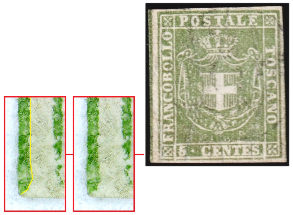Consideriamo ora il francobollo del valore da 5 centesimi in alto a destra della figura 2, esemplare perfettamente marginato che mostra sul lato sinistro la riga di composizione completa. Questo esemplare non è del tipo fil-let, ovvero la sua filigrana mostra solamente linee ondulate verticali intrecciate e nessuna traccia dei caratteri della dicitura 'II E RR POSTE TOSCANE'. La filigrana non è quindi in grado di fornirci indicazioni sulla posizione che questo francobollo occupava nel quadro di stampa. Tale informazione ci viene fornita però in questo caso dagli elementi tipografici visibili al recto del francobollo. La linea di composizione completa sul lato sinistro ci dice che l'esemplare occupava una delle posizioni nella prima colonna a sinistra delle 16 che componevano il quadro di stampa. Inoltre la particolare forma a freccia che assume la linea di composizione nella sua estremità inferiore, ci comunica che la posizione del francobollo era quella d'angolo in basso a sinistra, ovvero la 225. È noto infatti che le estremità delle linee di composizione in prossimità dei quattro spigoli del foglio, assumono una forma particolare simile a quella ritracciata in giallo nella seguente figura 7, ovvero raggiungendo il termine della riga questa prima si ispessisce leggermente per poi chiudersi con una forma curva fino a spessore nullo. La forma tipica appena descritta della riga di composizione in prossimità dello spigolo del foglio, si può osservare in altri esemplari mostrati in un articolo a cura di Danilo Vignati.