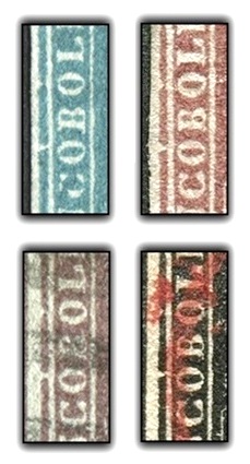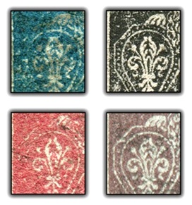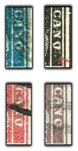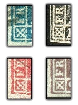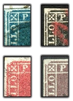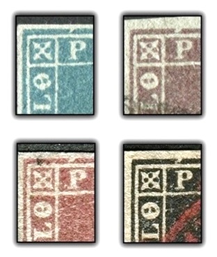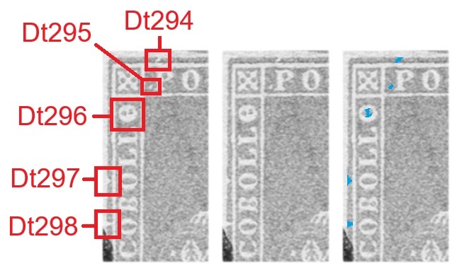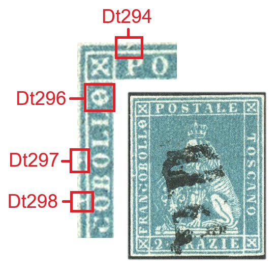 Nell'immagine di figura 5 che segue, abbiamo affiancato la porzione in alto a sinistra di quattro dei francobolli appena descritti. Si noti come il dettaglio Dt295, ovvero la piccola falla di colore prima del carattere 'P' della Dicitura 2, sia visibile solamente nei francobolli dei valori da 9 crazie, 1 crazia su filigrana del Primo Tipo e da 1 quattrino su filigrana del Secondo Tipo.