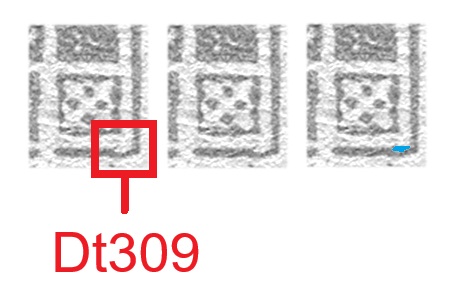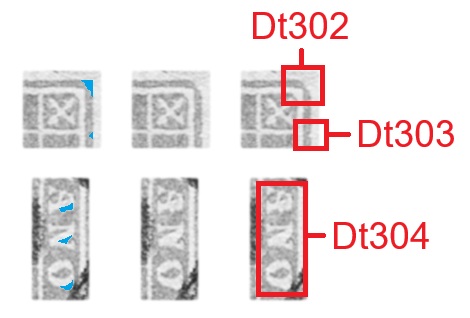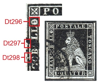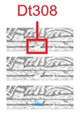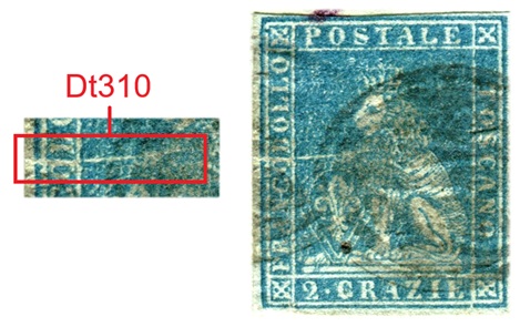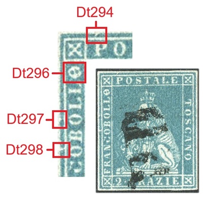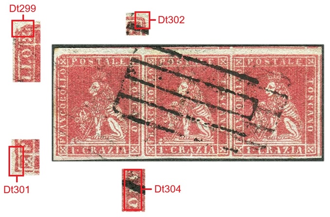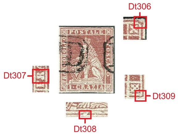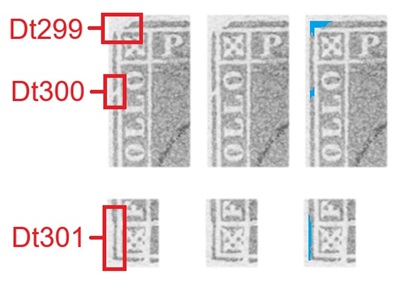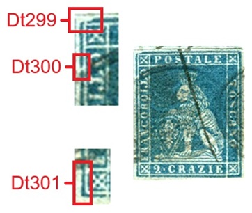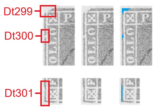 La figura 13 mostra invece il dettaglio Dt301, come appare negli stessi quattro francobolli. In questo caso non si osservano sostanziali differenze tra i diversi esemplari.