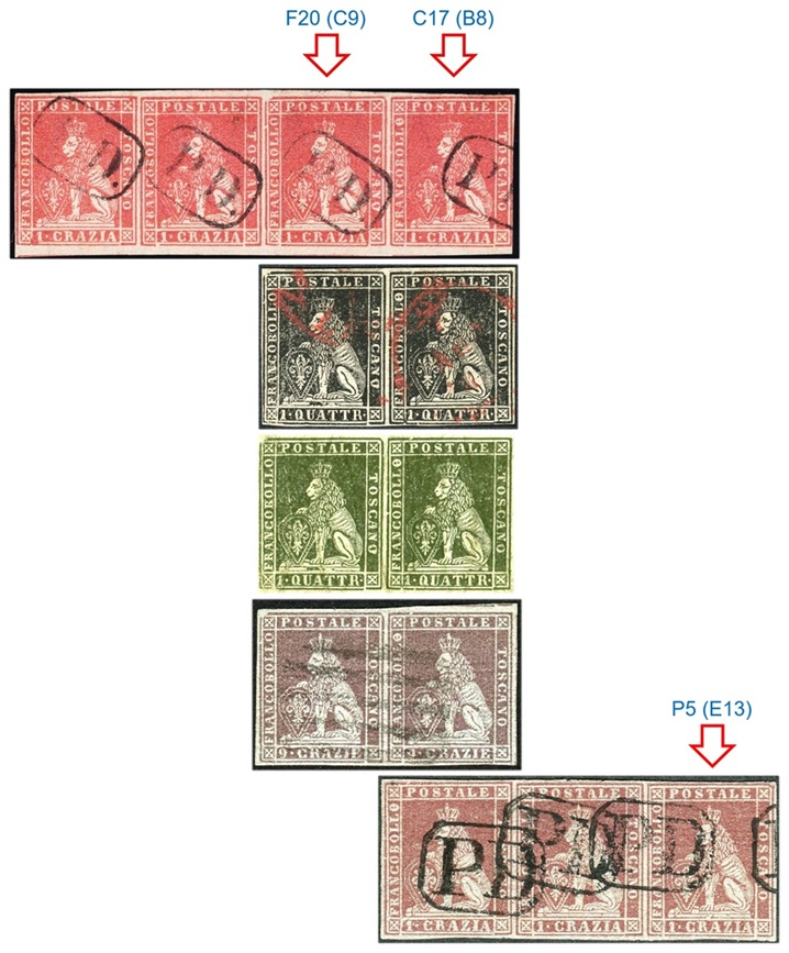 In un articolo apparso in precedenza in questa sede, abbiamo discusso della ricorrenza della varietà C17 (B8) nella posizione 68 del quadro di stampa, per i francobolli granducali di Toscana su filigrana del Secondo Tipo. Abbiamo anche mostrato come la varietà F20 (C9) ricorresse nella posizione precedente, la 67. In quella circostanza non abbiamo avuto modo di descrivere in dettaglio le caratteristiche di queste due varietà. Vogliamo quindi dedicare questa pubblicazione alla loro caratterizzazione, assieme ad una terza, la P5 (E13), presente in uno dei pezzi che mostreremo e ad una quarta la A9 (H1). Ricordiamo che le varietà sono denominate riportando prima il codice assegnato dal manuale di Calcagno-Morani e poi, tra parentesi, quello assegnato da Luigi Guido, rispettando l'ordine temporale di apparizione dei rispettivi lavori.